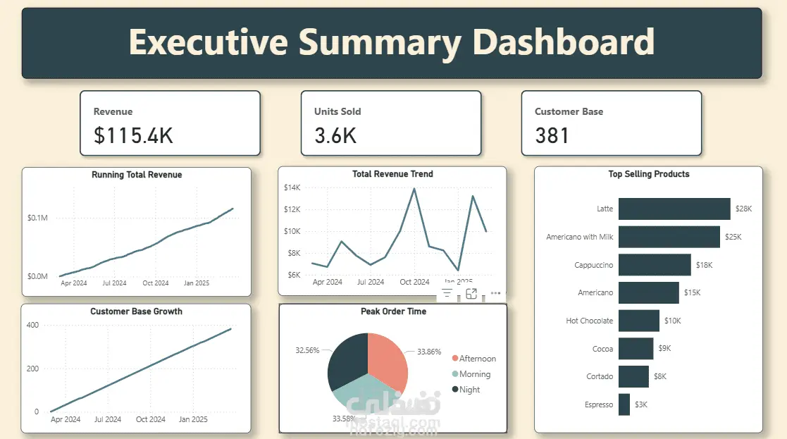تم تصميم لوحة معلومات تحليلية تفاعلية خصيصًا لعلامة تجارية ناشئة في مجال القهوة عبر الإنترنت، بهدف عرض مؤشرات الأداء الرئيسية بوضوح مثل إجمالي الإيرادات ونمو قاعدة العملاء. تقوم اللوحة بتحليل اتجاهات المبيعات لتقديم رؤية استراتيجية، وتحديد أنواع القهوة الأكثر مبيعًا وأوقات ذروة الطلبات، مما يساعد مباشرة في تحسين إدارة مخزون البن وتوجيه الحملات التسويقية. هذه الأداة تمكّن العلامة التجارية من اتخاذ قرارات سريعة وفعالة مبنية على البيانات، وفهم قصة الأرقام لتعزيز قدرتها التنافسية في السوق.