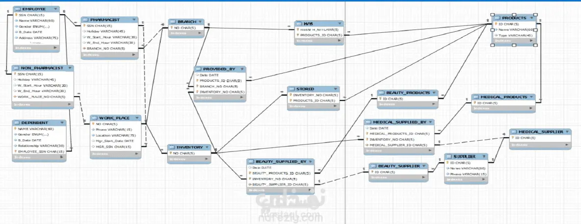تم تصميم وبناء قاعدة بيانات علائقية متكاملة لإدارة العمليات التشغيلية لسلسلة صيدليات، حيث يغطي المخطط جميع الجوانب الأساسية للعمل بدءًا من إدارة الموظفين والفروع، ووصولًا إلى تتبع المخزون وإدارة المنتجات بنوعيها الطبي والتجميلي وعلاقات الموردين. الهدف الأساسي من هذا النظام هو تنظيم وتخزين المعلومات الحيوية حول الأدوية والمخزون لضمان إدارة دقيقة وفعالة وآمنة داخل نظام الصيدليات. يساعد هذا في إدارة المخزون بفاعلية، ومنع الأخطاء، وتمكين الوصول السريع إلى المعلومات الأساسية للمهنيين الصحيين.