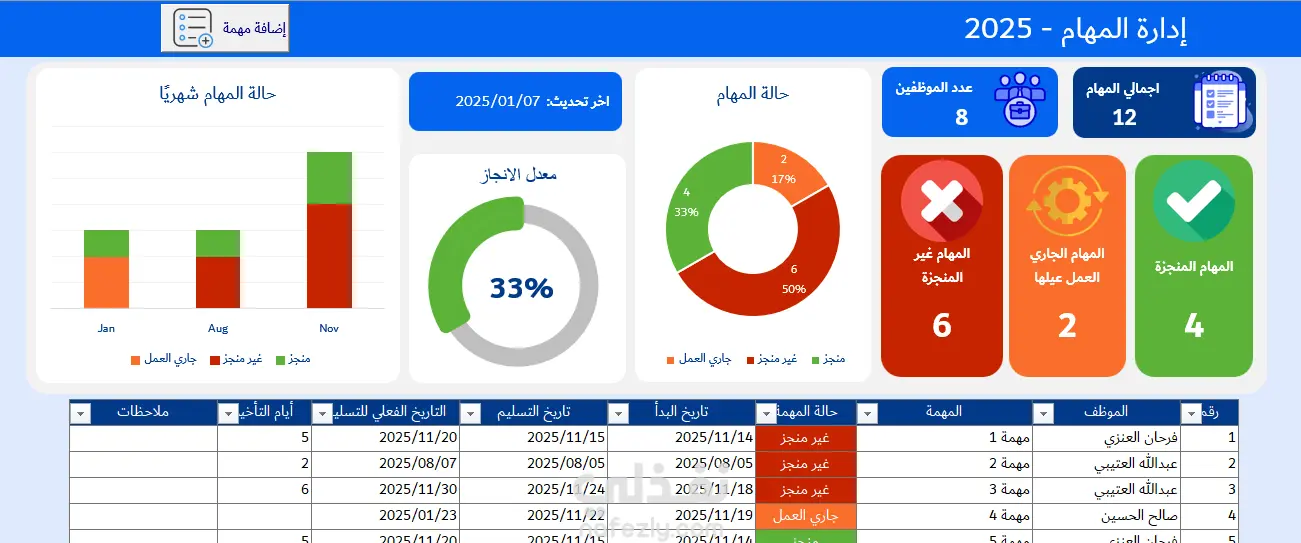 لوحة متابعة مهام، توضح حالة الإنجاز لكل مهمة، ونسبة التقدم، مع توزيع شهري للحالة ومؤشرات الأداء.