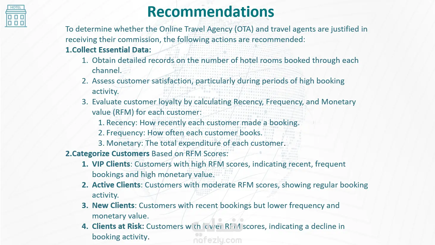 Report Highlights: 1. Business Problem: A mid-sized hotel struggles to manage bookings from different channels efficiently. This report aims to understand the financial impacts of each channel to optimize strategy, reduce costs, and improve profitability. 2. Dashboard Overview: The interactive dashboard includes key graphs: Net Revenue per Month Bookings per Month Booking Number and Percent for Each Channel Net Revenue vs. Commission Revenue and Profit for Each Channel 3. Description and Insights for Each Graph. 4. Summary: While OTAs drive significant bookings, direct bookings through the hotel's website and corporate partnerships are more profitable due to lower commission costs. A balanced strategy leveraging both high-volume and high-profit channels is essential. 5. Limitations: Currently, data is insufficient to justify commissions for OTAs and travel agents. Additional data is needed on: The number of hotel rooms booked through each channel Client satisfaction levels, especially during high booking periods Client loyalty metrics (Recency, Frequency, Monetary value) 6. Recommendations: _ Collect Essential Data: Detailed records of bookings, customer satisfaction assessments, and loyalty evaluations. _ Categorize Customers Based on RFM Scores: - VIP Clients: High RFM scores - Active Clients: Moderate RFM scores - New Clients: Recent bookings but lower frequency and value - Clients at Risk: Lower RFM scores _ Analyze Channel Performance: Identify valuable customers from each channel and enhance marketing efforts for the most productive channels. Implementing these recommendations will help understand the effectiveness of OTAs and travel agents in driving valuable bookings and making informed decisions about commission justification. This approach will also optimize marketing strategies to target the most profitable customer segments.