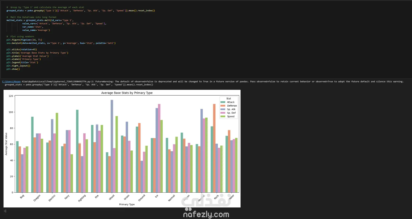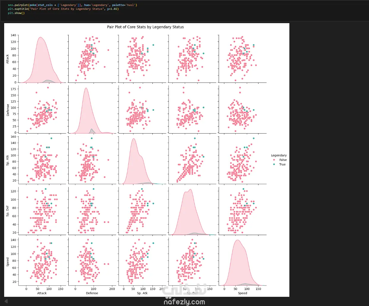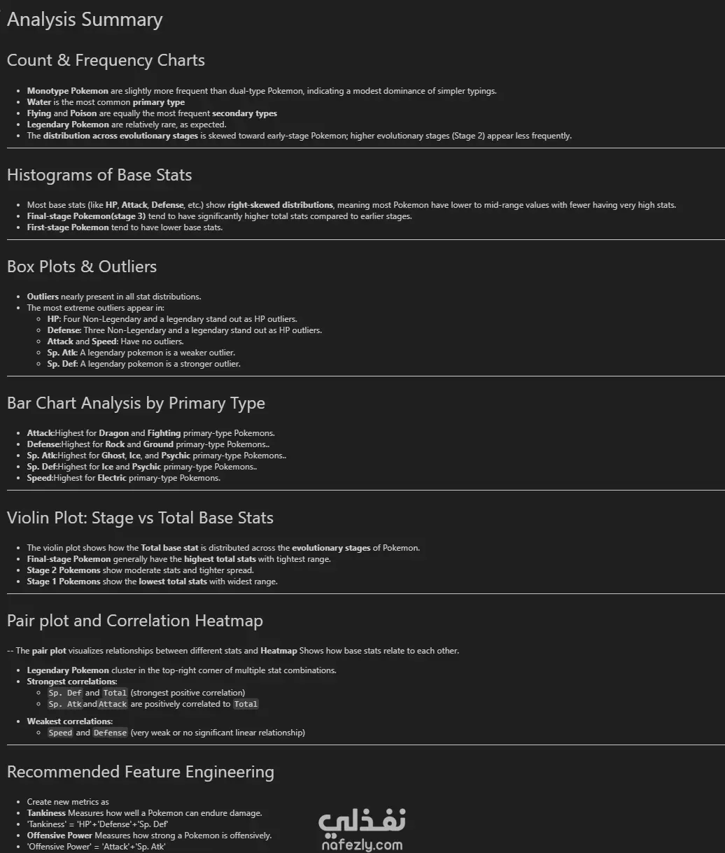 تنظيف البيانات والتعامل مع القيم المفقودة وتصحيح الأنواع غير المتناسقة. تطبيق Label Encoding وNormalization لتجهيز البيانات لنماذج Machine Learning مستقبلية. إجراء تحليل بياني شامل (EDA) لاكتشاف العلاقات بين الخصائص مثل النوع (Type) وقوة الهجوم (Attack) والسرعة (Speed). إنشاء تصوّرات بيانية مثل Correlation Heatmaps وBar Charts وPair Plots لتوضيح الأنماط والارتباطات.