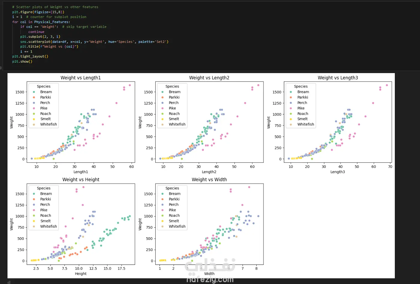 تم تنفيذ تحليل واستكشاف البيانات (Exploratory Data Analysis - EDA) لمجموعة بيانات الأسماك بهدف فهم العلاقة بين الخصائص الفيزيائية (مثل الطول والعرض والارتفاع) وخصائص السمكة الأخرى مثل الوزن والنوع.