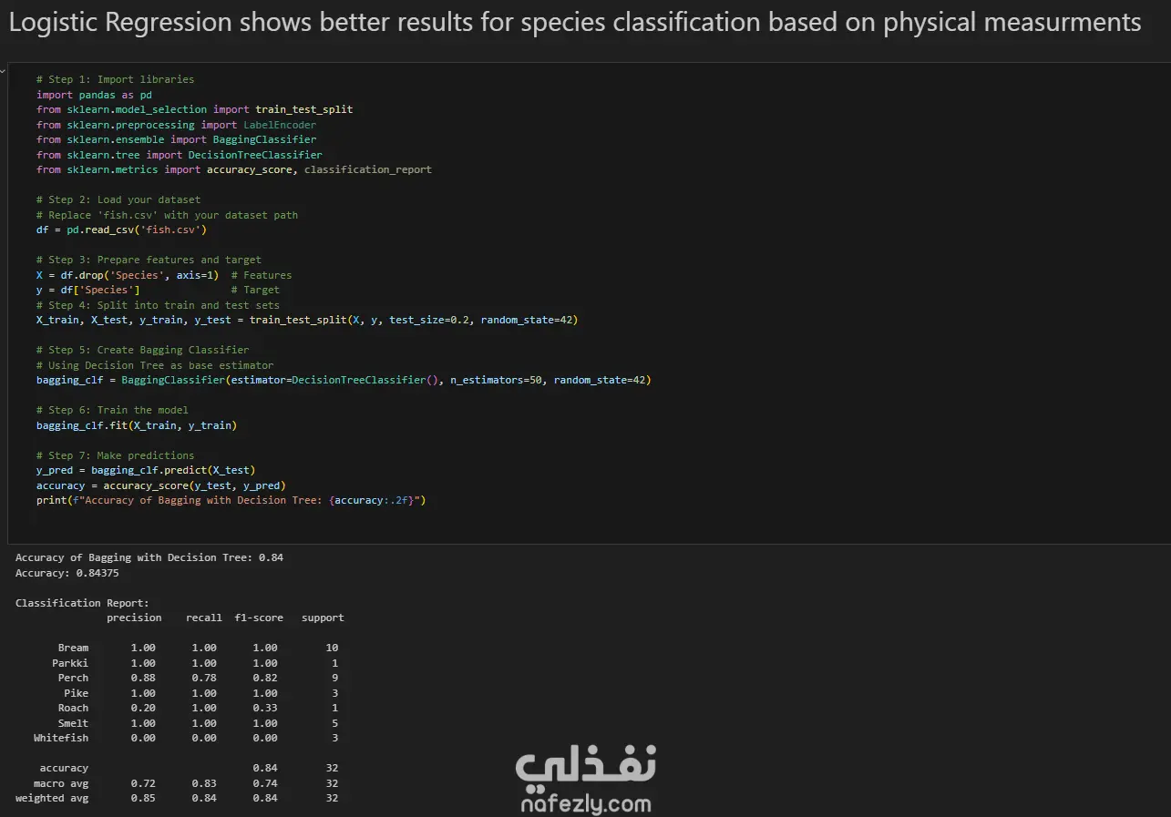 تطبيق نماذج Logistic Regression, Decision Tree, وK-Nearest Neighbors (KNN) لتحديد نوع السمكة من خلال قياساتها الفيزيائية.