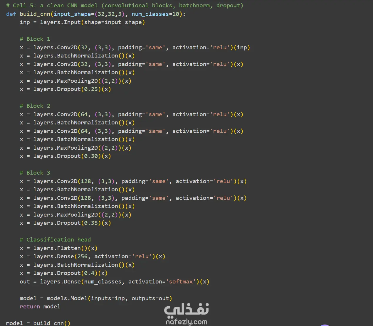 تم تطوير نموذج Deep Learning باستخدام Convolutional Neural Networks (CNNs) لتصنيف الصور من مجموعة بيانات CIFAR-10 التي تحتوي على 60,000 صورة في 10 فئات مختلفة (مثل السيارات، الطائرات، والطيور). يشمل المشروع: معالجة الصور وتطبيعها (Image Preprocessing & Normalization) بناء نموذج CNN باستخدام TensorFlow / Keras تجربة تحسين النموذج باستخدام Dropout وBatch Normalization تقييم الأداء من خلال Accuracy وConfusion Matrix عرض النتائج عبر منحنيات Training vs Validation Accuracy الأدوات والتقنيات المستخدمة Python, TensorFlow, Keras, NumPy, Matplotlib, Jupyter Notebook