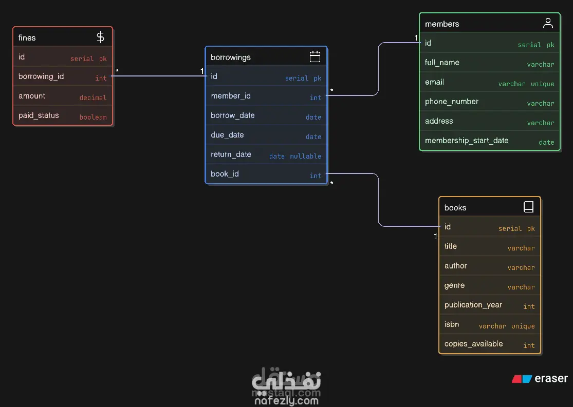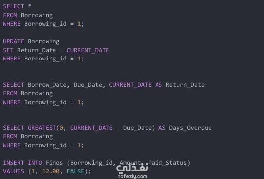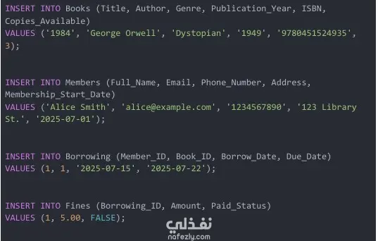 تصميم وتنفيذ قاعدة بيانات علائقية قوية لإدارة الكتب والأعضاء وعمليات الاستعارة والغرامات، مع ضمان الكفاءة والموثوقية.