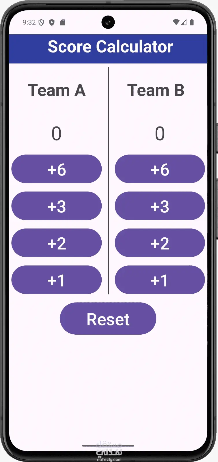 تطبيق أندرويد بسيط لحساب النقاط بين فريقين (Team A & Team B). يسمح للمستخدم بزيادة النقاط وفق قواعد محددة (1 – 2 – 3 – 6 نقاط)، مع إمكانية إعادة التعيين (Reset) للنتيجة. تم تصميم التطبيق ليكون سهل الاستخدام بواجهة واضحة ومنظمة.