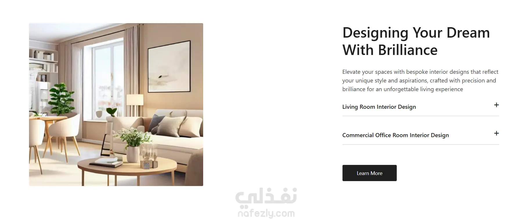 Landing Page أنيقة وبسيطة مخصصة لعرض خدمات تصميم الديكور الداخلي.