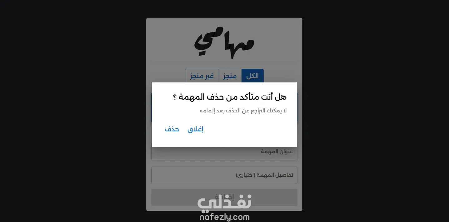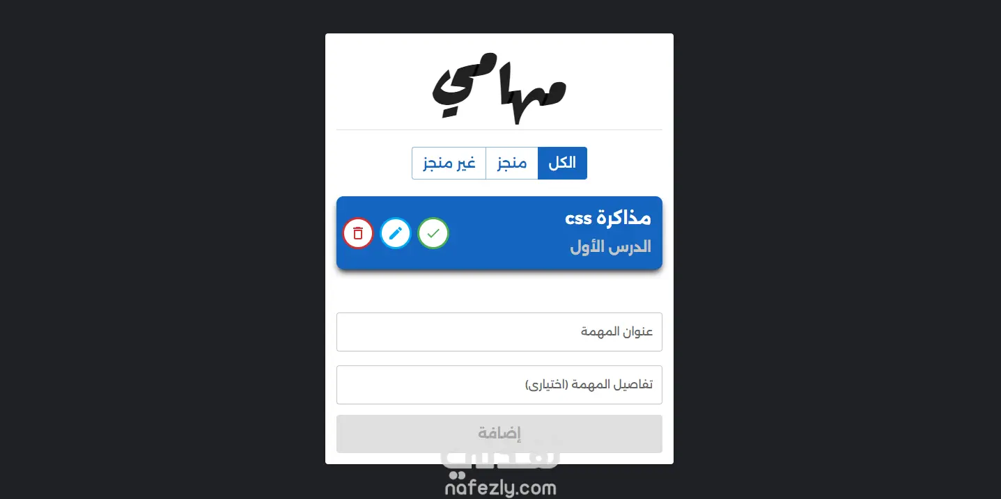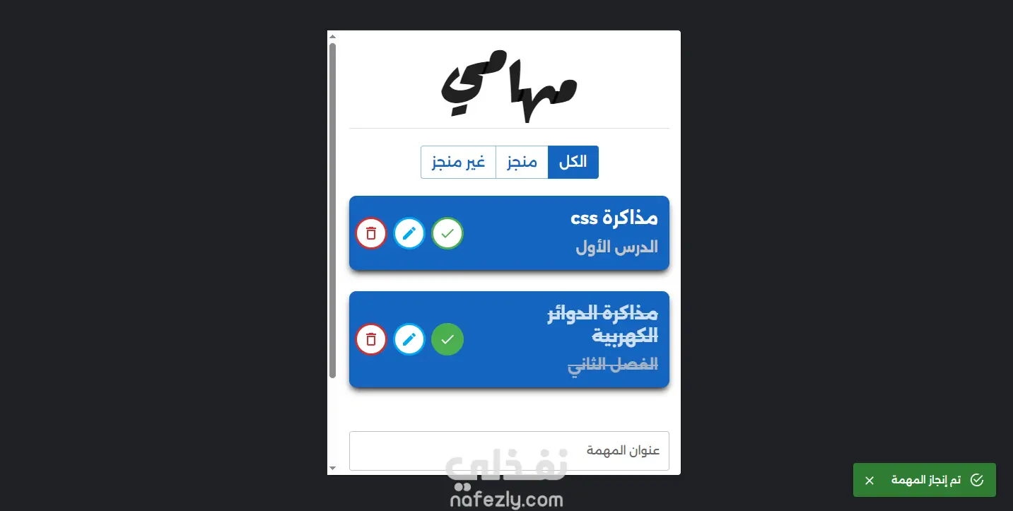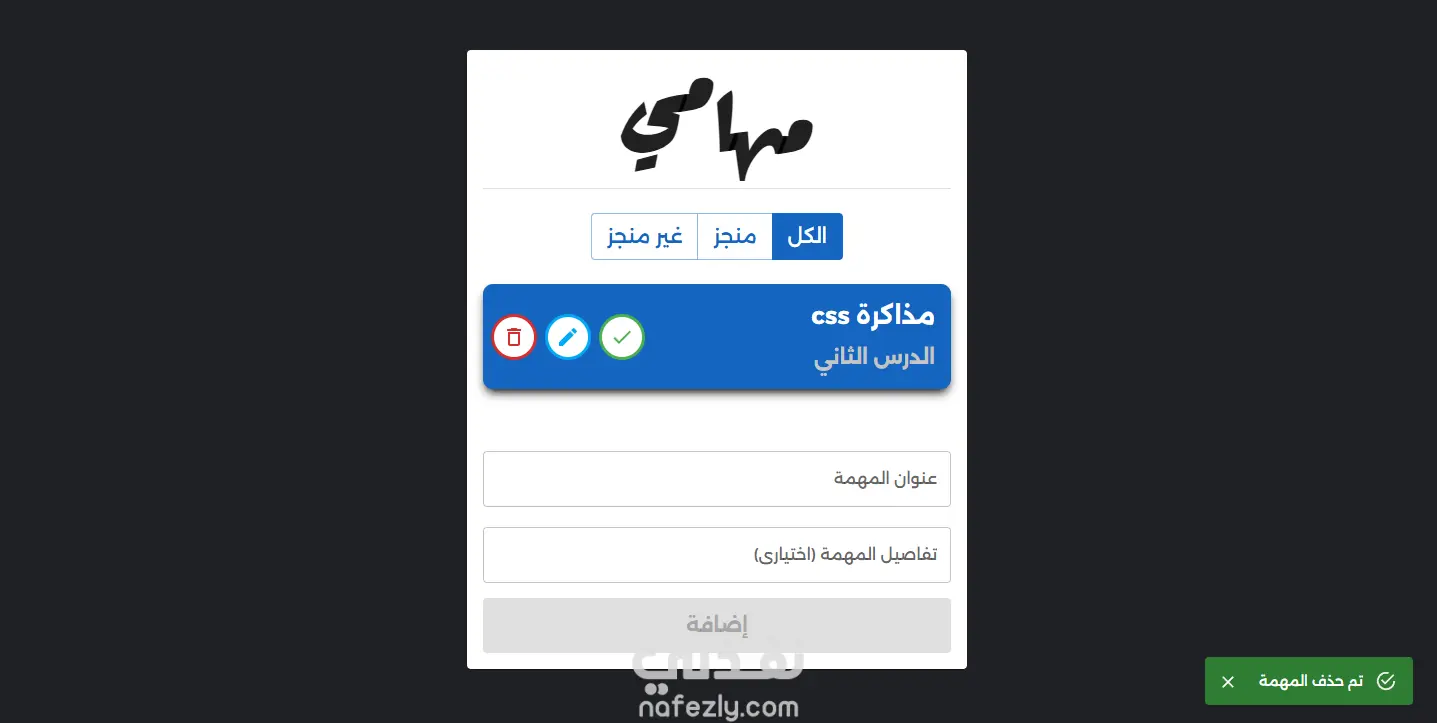 "مهامي" هو تطبيق ويب بسيط ومنظم لإدارة المهام اليومية، تم تطويره باستخدام React. يتيح للمستخدم إضافة المهام الجديدة، وتعديلها، وحذفها، وتحديد المهام المنجزة لسهولة المتابعة. يحتوي التطبيق على نظام تنبيهات صغير يظهر للمستخدم عند تنفيذ أي عملية مثل الإضافة أو التعديل أو الحذف، مما يجعل التجربة تفاعلية وواضحة. كما يتيح فلترة المهام حسب الحالة (الكل – المنجز – غير المنجز) بتصميم عصري متجاوب يناسب جميع الأجهزة.