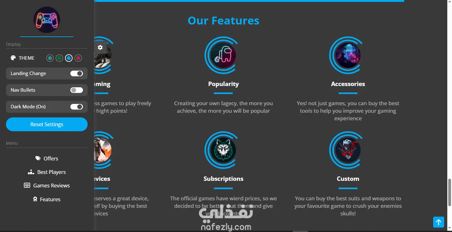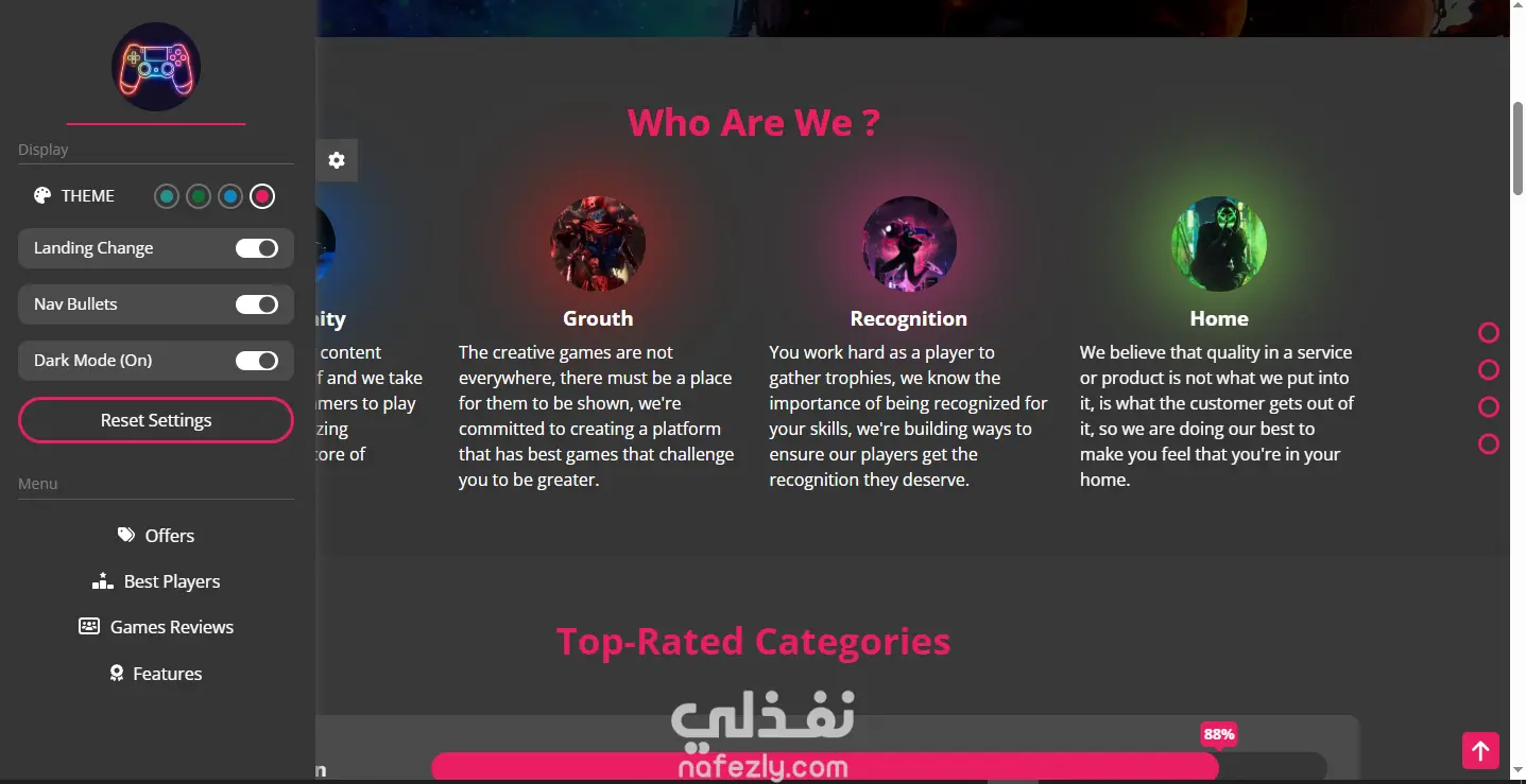 موقع ألعاب تفاعلي تم تطويره باستخدام JavaScript، يتيح للمستخدم تجربة سلسة وممتعة. يحتوي الموقع على وضع ليلي (Dark Mode) وخاصية لتغيير الألوان الرئيسية حسب ذوق المستخدم، مما يجعل التجربة أكثر تخصيصًا.