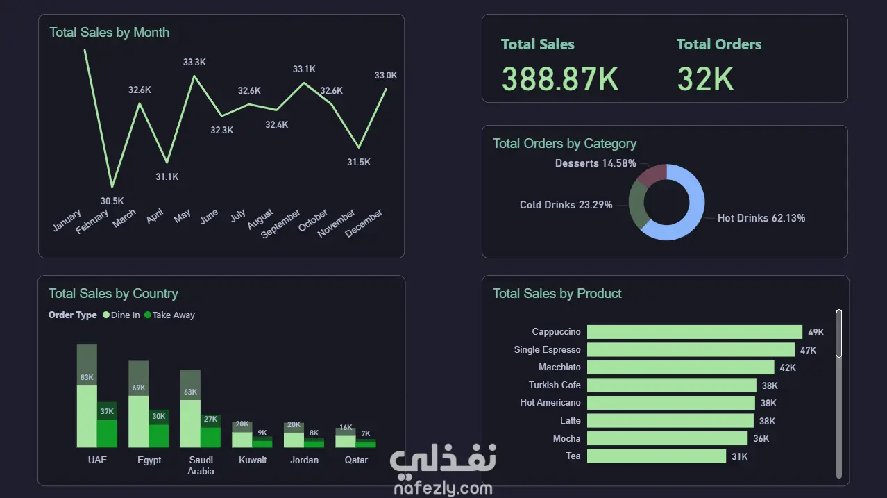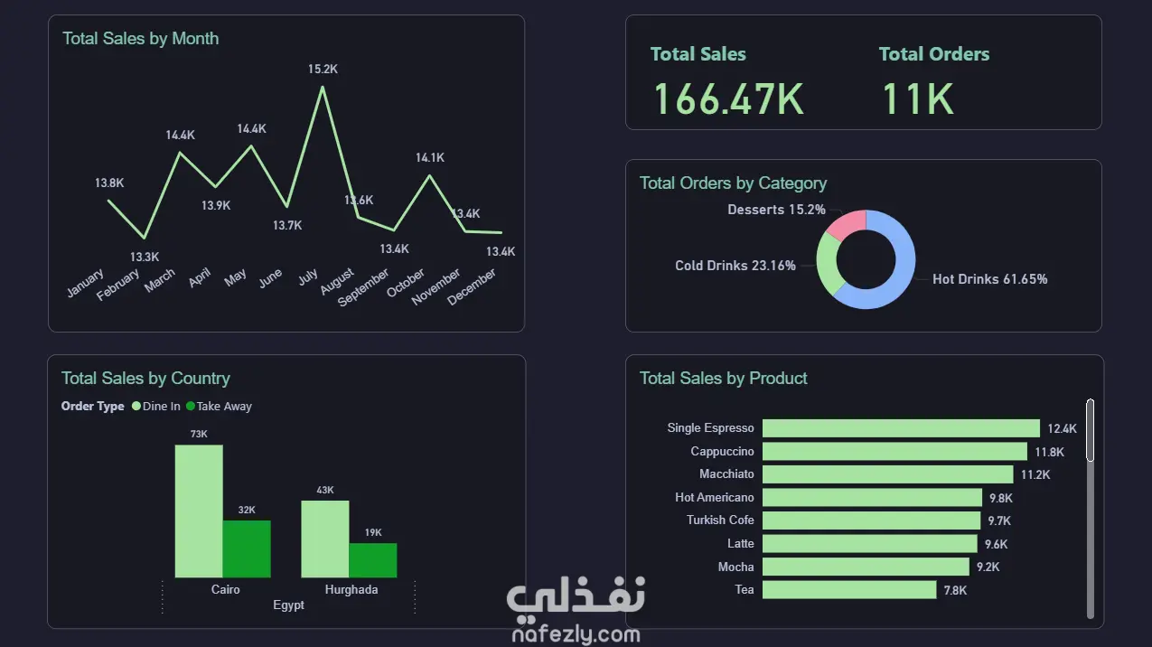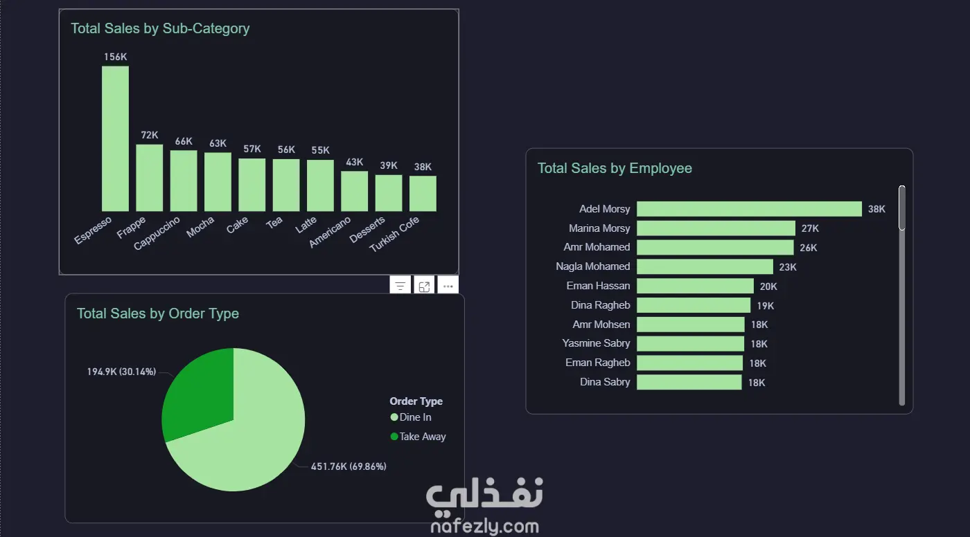 أنشأت لوحة معلومات توضح أهم الرؤى من بيانات مبيعات المقهى، وتشمل: إجمالي المبيعات والطلبات اتجاهات المبيعات الشهرية المنتجات الأكثر مبيعًا توزيع المبيعات حسب الفئات إجمالي المبيعات حسب الموظف