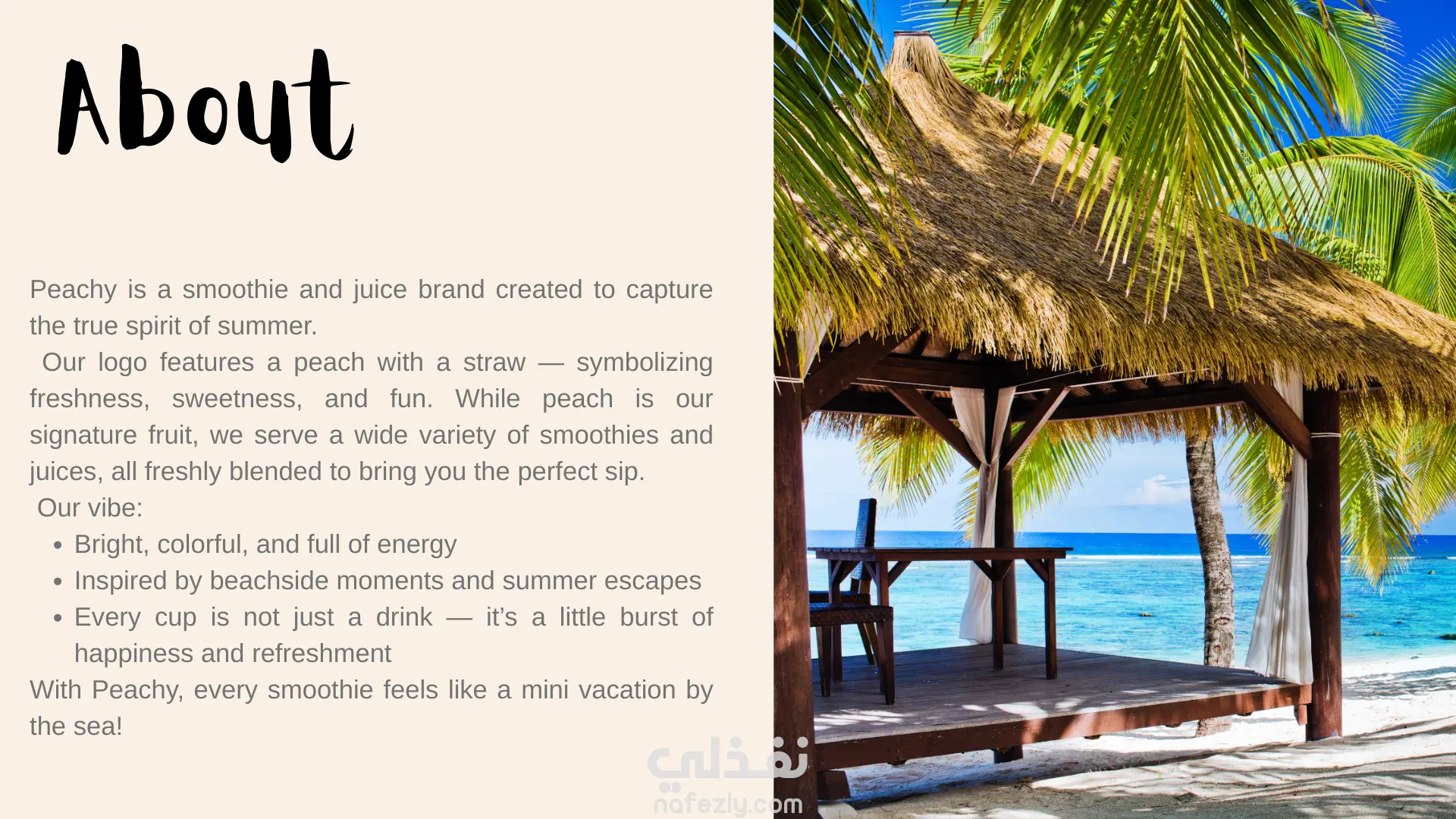 وُلدت علامة Peachy من رؤيتي كمصممة لأجسّد من خلالها روح الصيف المليئة بالمرح والدفء وألوان الشاطئ. حرصت على أن يعكس كل تفصيل في الهوية — من شعار الخوخ مع الشفاطة إلى لوحة الألوان الزاهية — إحساس الانتعاش، والحلاوة، والبهجة. كانت الفكرة بسيطة: أن أبتكر هوية بصرية تجعل كل رشفة تبدو كأنها عطلة صغيرة تحت شمس البحر. من خلال الخطوط المرحة، والألوان الحيوية، والأشكال الطبيعية، تجسّد Peachy إحساس البهجة الصيفية والإيجابية الشبابية. إنها ليست مجرد علامة لعصائر وسموذي، بل احتفال بلحظات مليئة بالشمس، والنكهة، والسعادة.