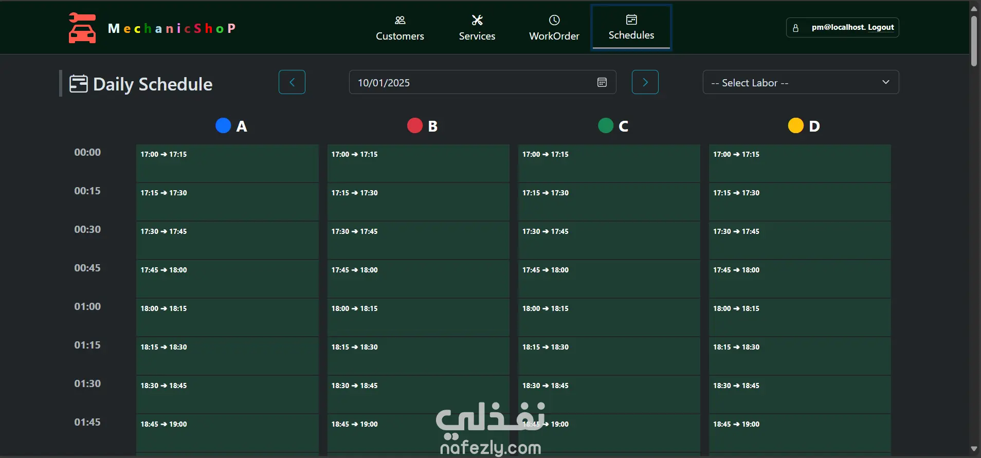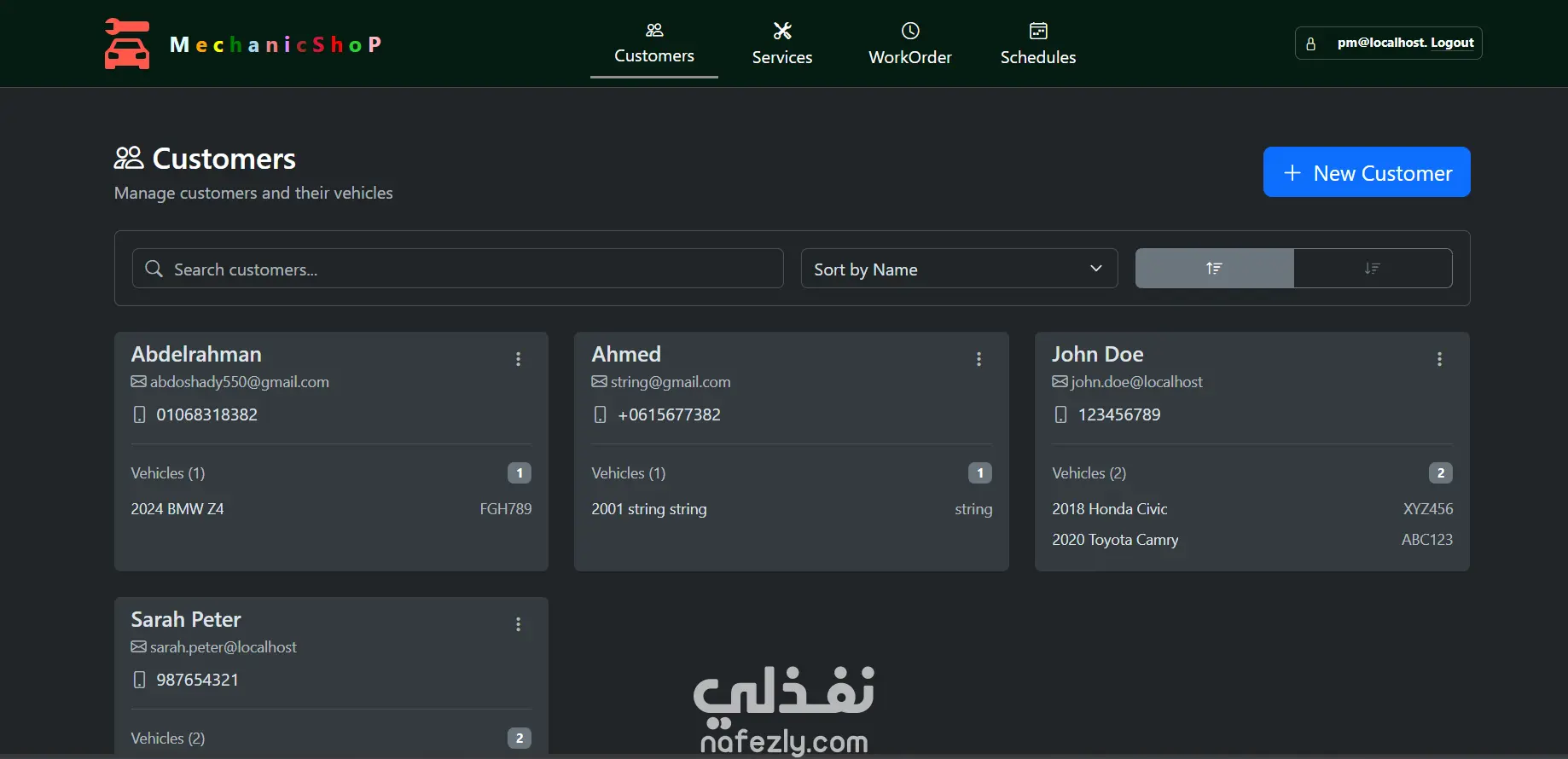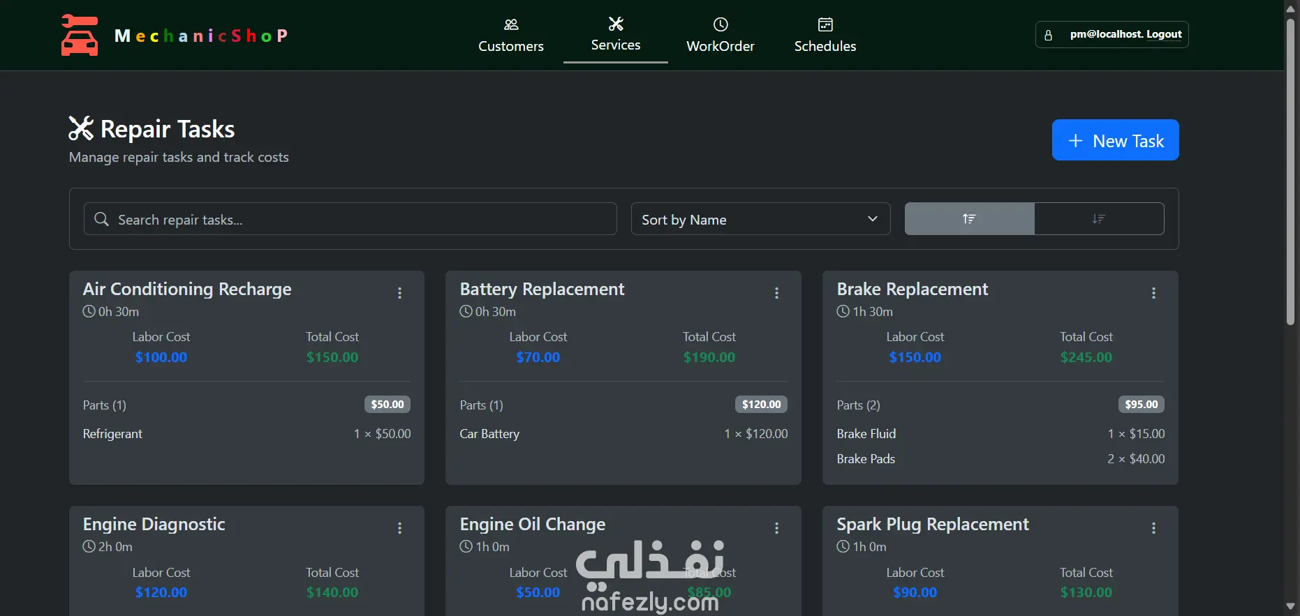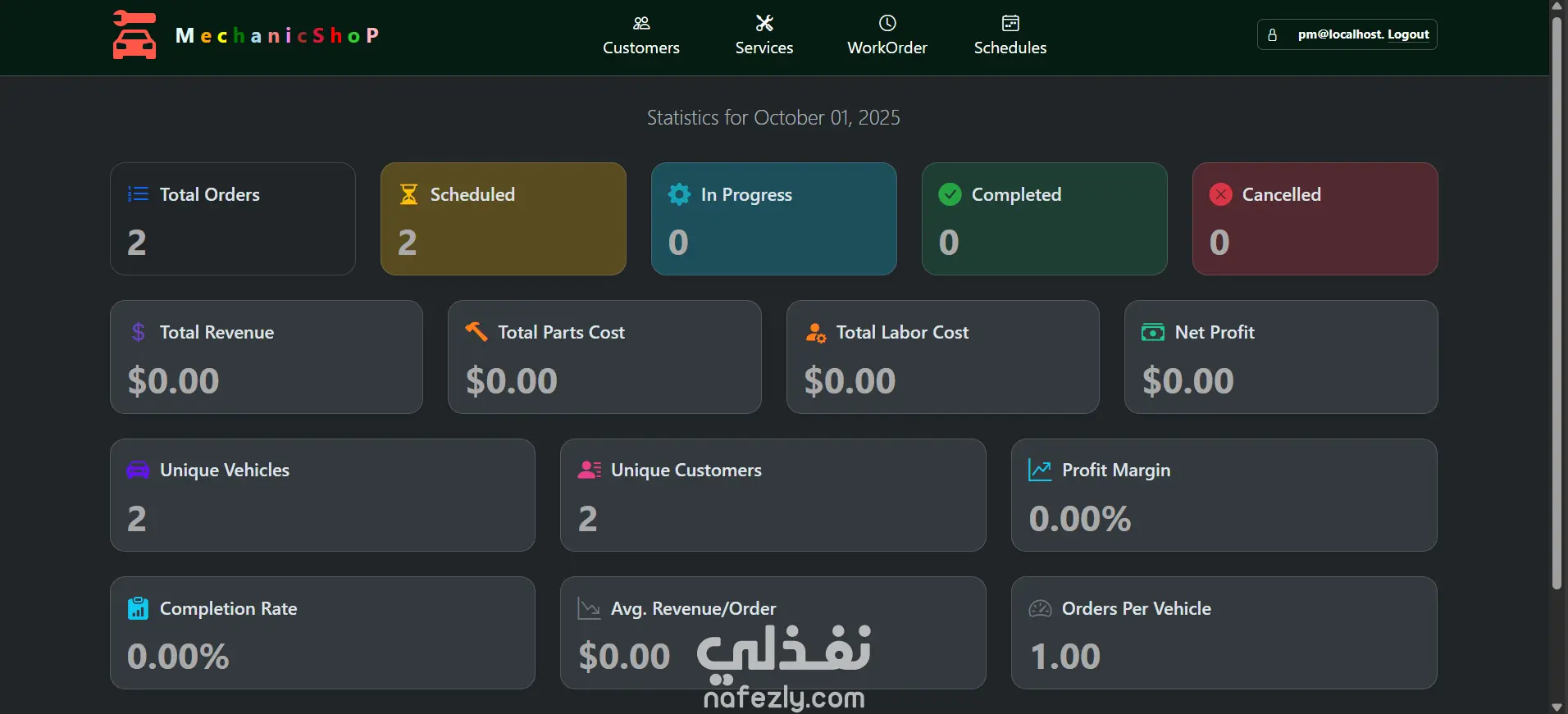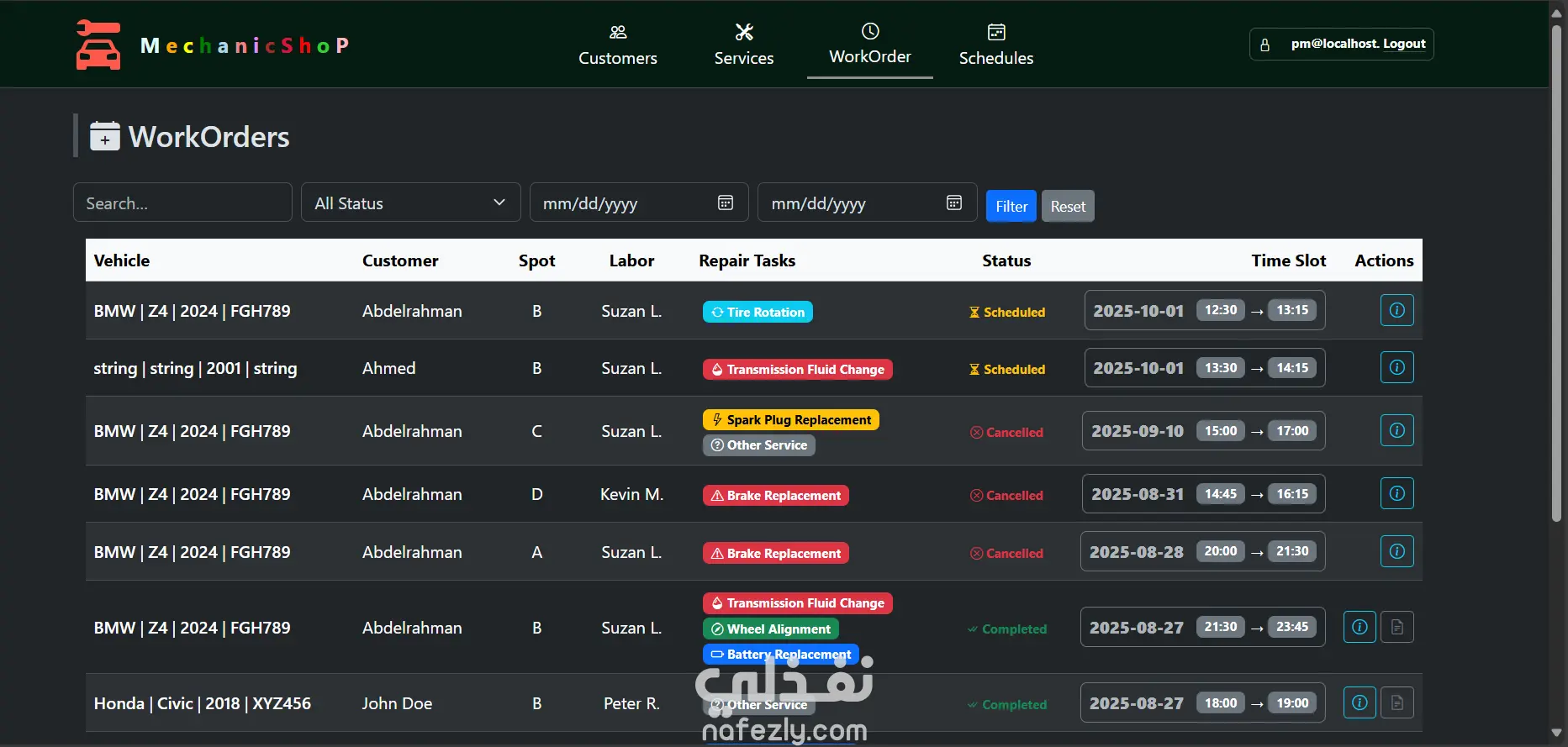 MechanicShop System, this project is a modern web application designed to streamline the operations of a mechanic workshop: manage customers and vehicles, schedule and relocate work orders by spot and time, track states, define repair tasks and labor, and handle invoicing (issue, fetch, PDF download, mark paid) with role-based access. 🚀