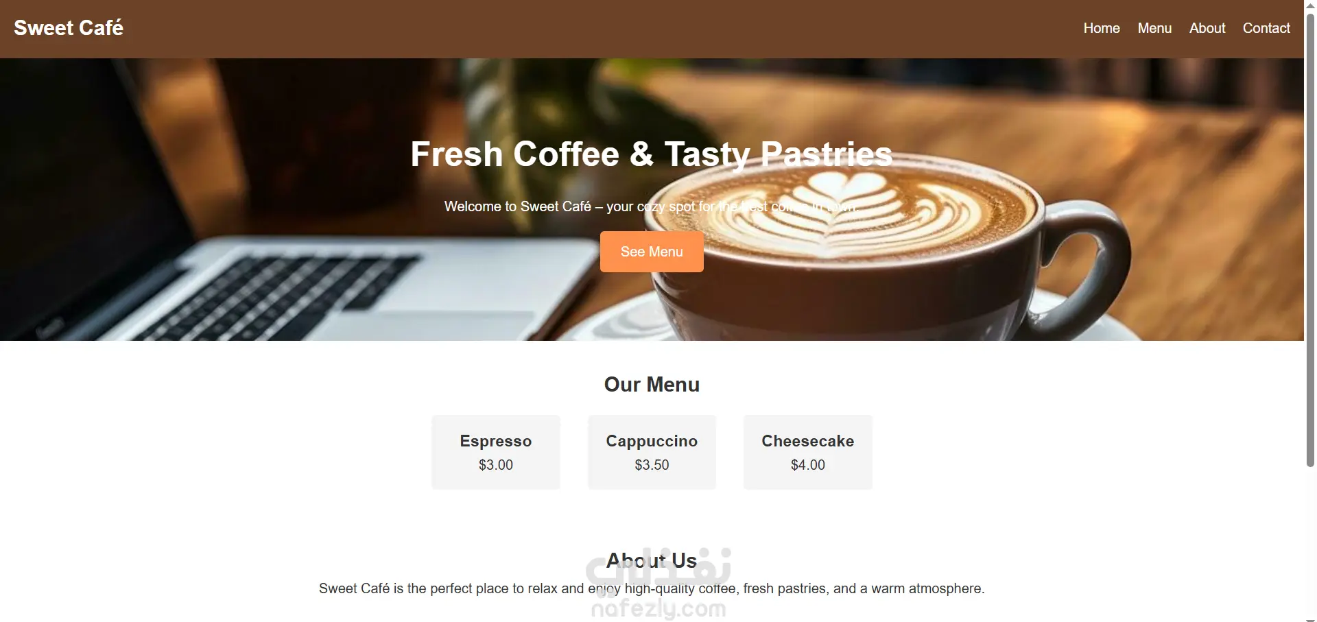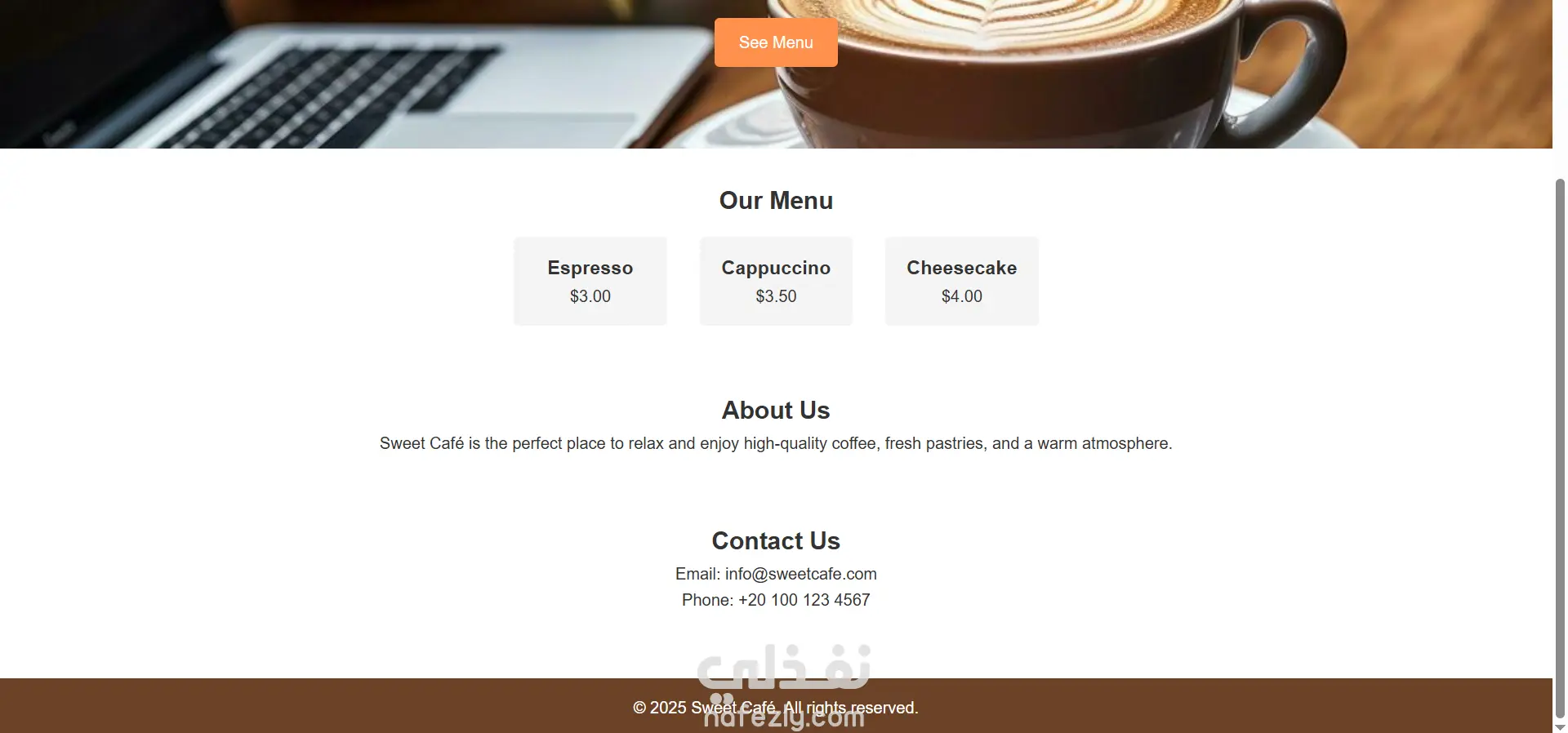 صفحة هبوط بسيطة لمطعم/كافيه بتعرض القائمة، نبذة تعريفية، ووسائل التواصل. التصميم معمول بـ HTML و CSS وبيشتغل بشكل متجاوب على كل الأجهزة.