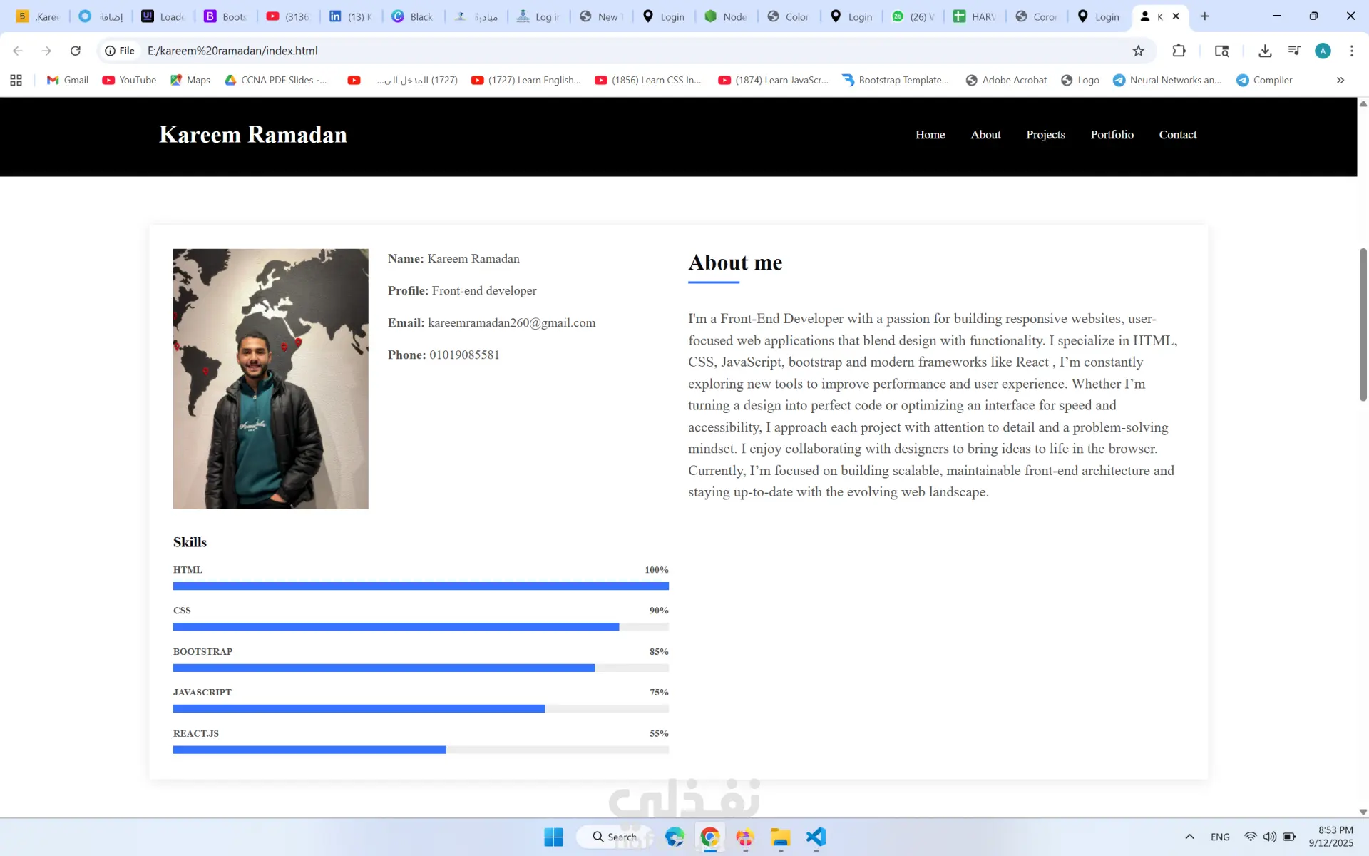 هذا الموقع هو معرض أعمالي الشخصي حيث أستعرض من خلاله مشاريع تطوير الويب التي عملت عليها. يهدف الموقع إلى تقديم نماذج عملية تعكس مهاراتي في تصميم وبرمجة واجهات المستخدم الحديثة. يمكنك من خلاله التعرف على خبرتي، مهاراتي، وأسلوب عملي في تنفيذ المشاريع.