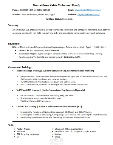 قمت بإعداد سيرة ذاتية احترافية بنظام ATS مخصصة لطالب وخريجين في كلية الهندسة، بحيث تكون متوافقة تماماً مع أنظمة التتبع المستخدمة في التوظيف وتزيد من فرص القبول في الشركات.