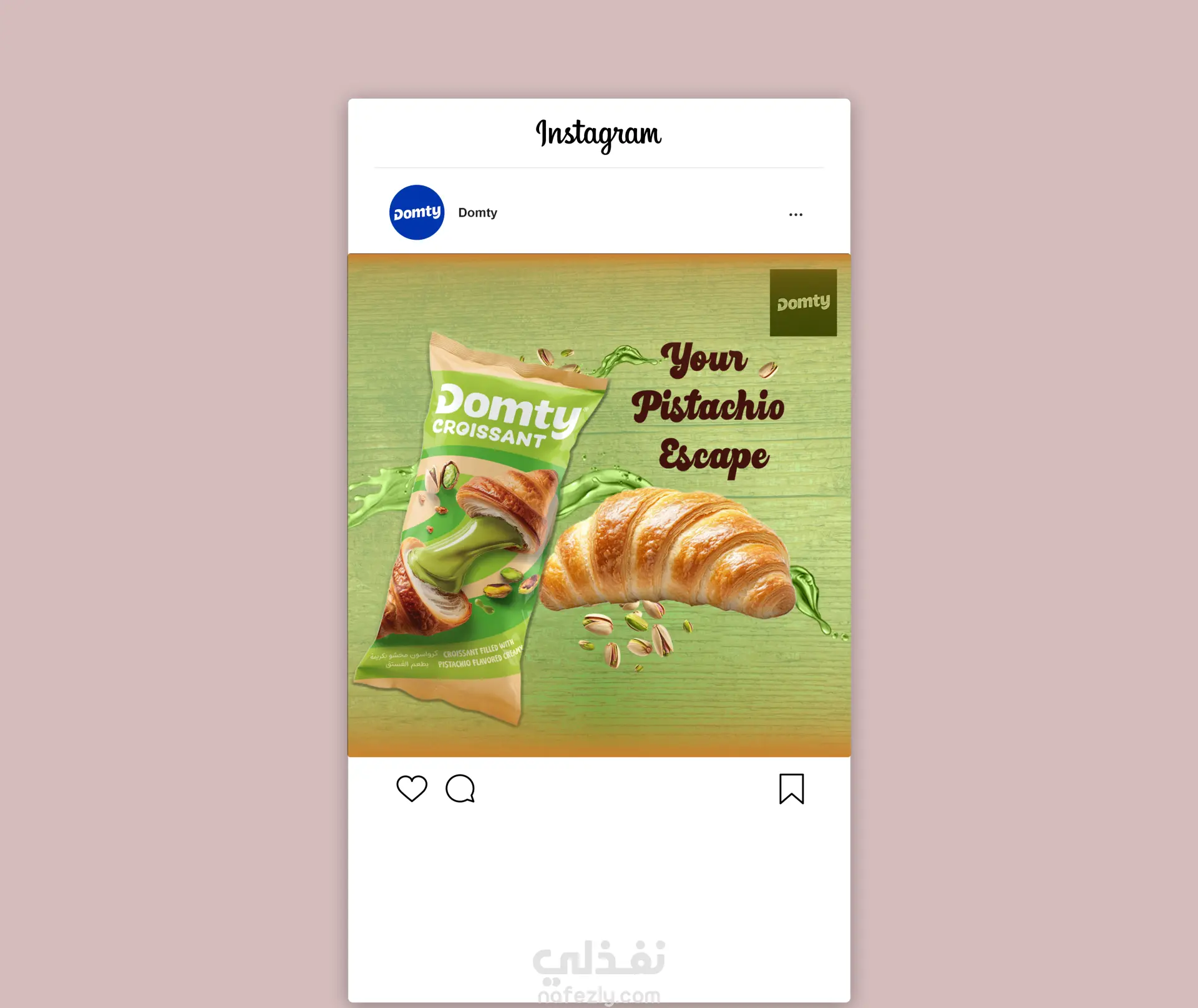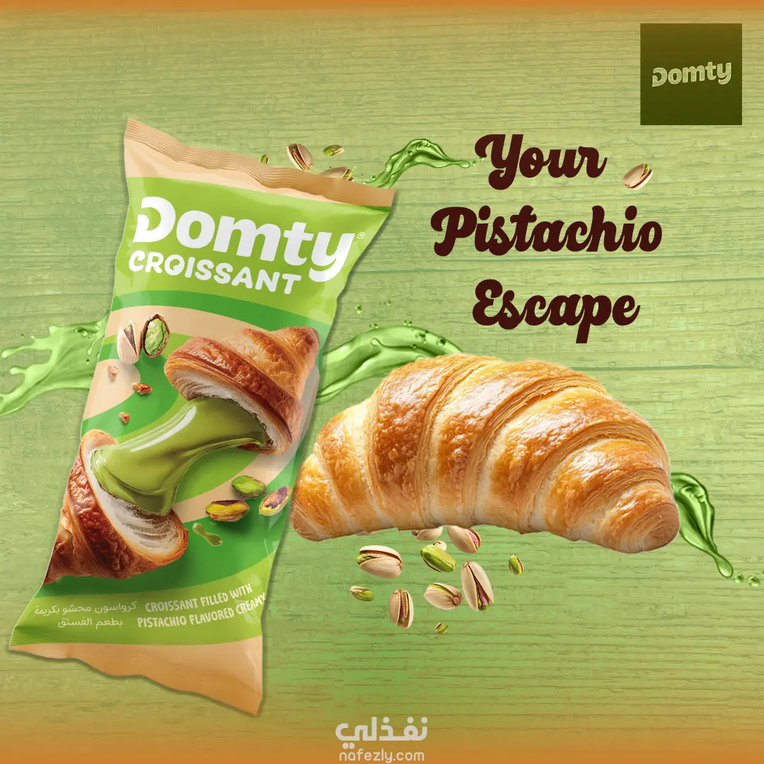 تصميم إعلان سوشيال ميديا غير رسمي لمنتج "دومتي كرواسون" بنكهة الفستق. يهدف التصميم إلى تسليط الضوء على المنتج الجديد بشكل جذاب وإيصال فكرة المذاق الغني والفريد من نوعه.