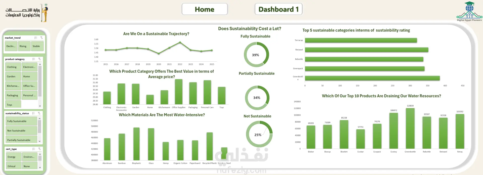قمت انا بتنفيذ مشروع تحليلي شامل لتقييم الأداء البيئي والاقتصادي للكيانات والمنتجات على مستوى عالمي. ركز التحليل على خمسة مؤشرات أداء رئيسية (كالكربون، المياه، والنفايات) وتضمن بناء لوحات تحكم تفاعلية. كشفت النتائج عن مسار الاستدامة العالمي (بنسبة 39% مستدام بالكامل)، وأفضل قيمة مقابل السعر في فئات المنتجات، والمواد الأكثر استهلاكاً للمياه. الهدف هو تزويد الإدارة العليا برؤى حاسمة لتوجيه الاستثمار نحو الأسواق المستدامة، وتحسين الكفاءة البيئية، والمقارنة بالأداء العالمي.