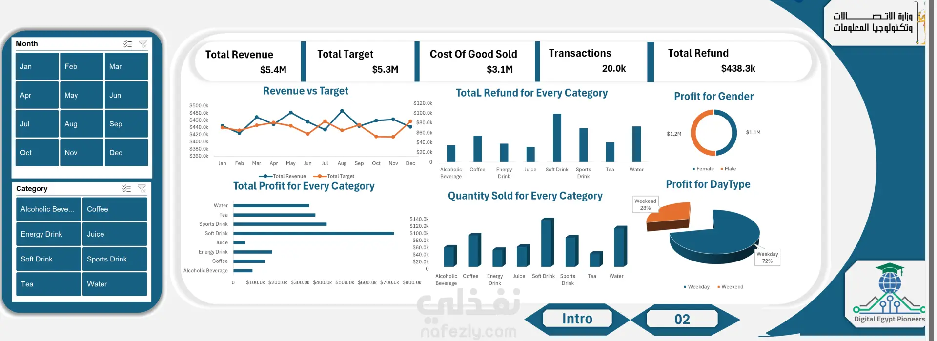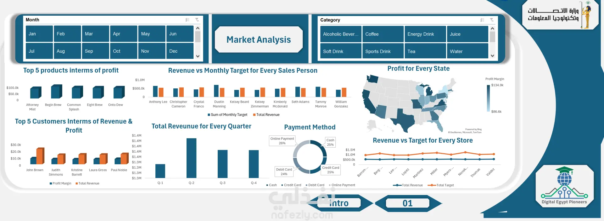 قمت انا بتنفيذ مشروع شامل لتحليل بيانات المبيعات، مع التركيز على بناء لوحات تحكم (Dashboards) تفاعلية لتتبع مؤشرات الأداء الرئيسية (KPIs) على دورات شهرية وربع سنوية.