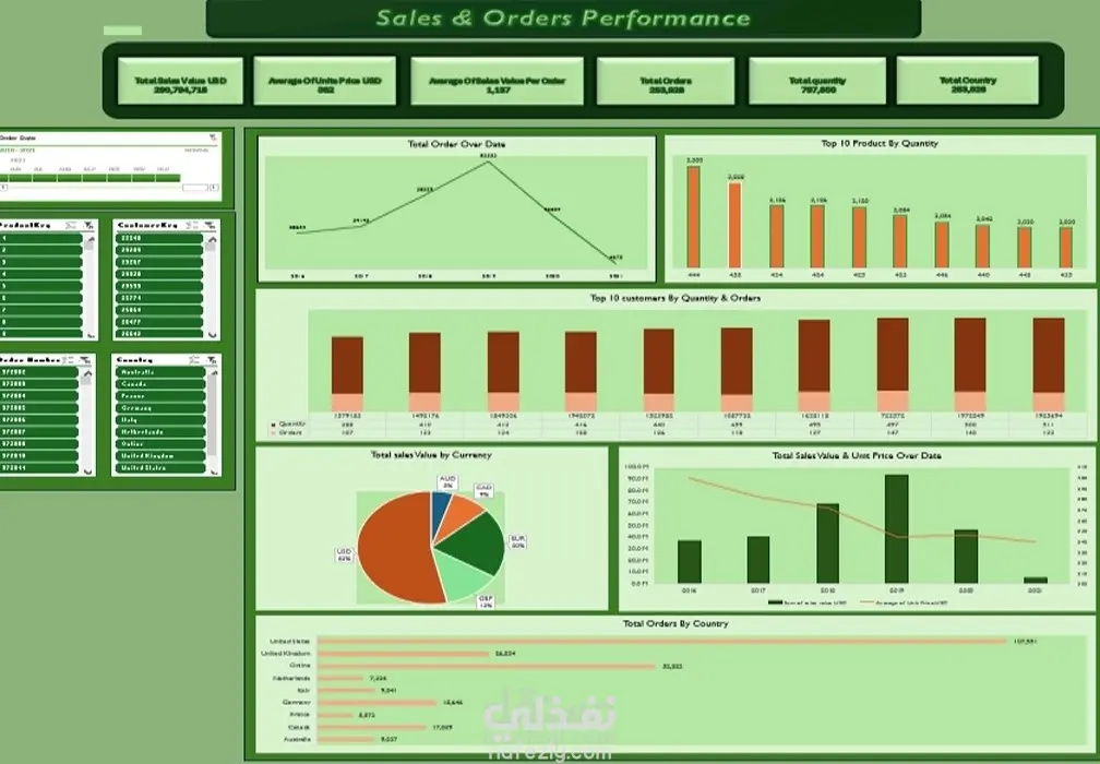 مميزات الداش بورد المعروضة في النموذج: عرض إجمالي قيمة المبيعات بالدولار، ومتوسط سعر الوحدة، ومتوسط قيمة الطلب. عدد الأوامر الإجمالية، وإجمالي الكميات، وعدد الدول المستهدفة. رسم بياني يوضح تطور عدد الطلبات عبر السنوات. عرض أفضل 10 منتجات مبيعاً حسب الكمية. قائمة أعلى 10 عملاء من حيث الكمية وعدد الأوامر. رسم بياني دائري يوضح توزيع قيمة المبيعات حسب العملة. مقارنة بين قيمة المبيعات ومتوسط أسعار الوحدات عبر الزمن. ترتيب عدد الطلبات حسب الدول مع رسم بياني توضيحي. الفوائد: تسهل على الإدارة معرفة الأداء العام بسرعة. تُمكِّن من تحديد أفضل العملاء والمنتجات والأسواق. تساعد في متابعة اتجاهات المبيعات عبر الوقت. إمكانية تخصيصها لتناسب أي نشاط تجاري أو بيانات مختلفة.