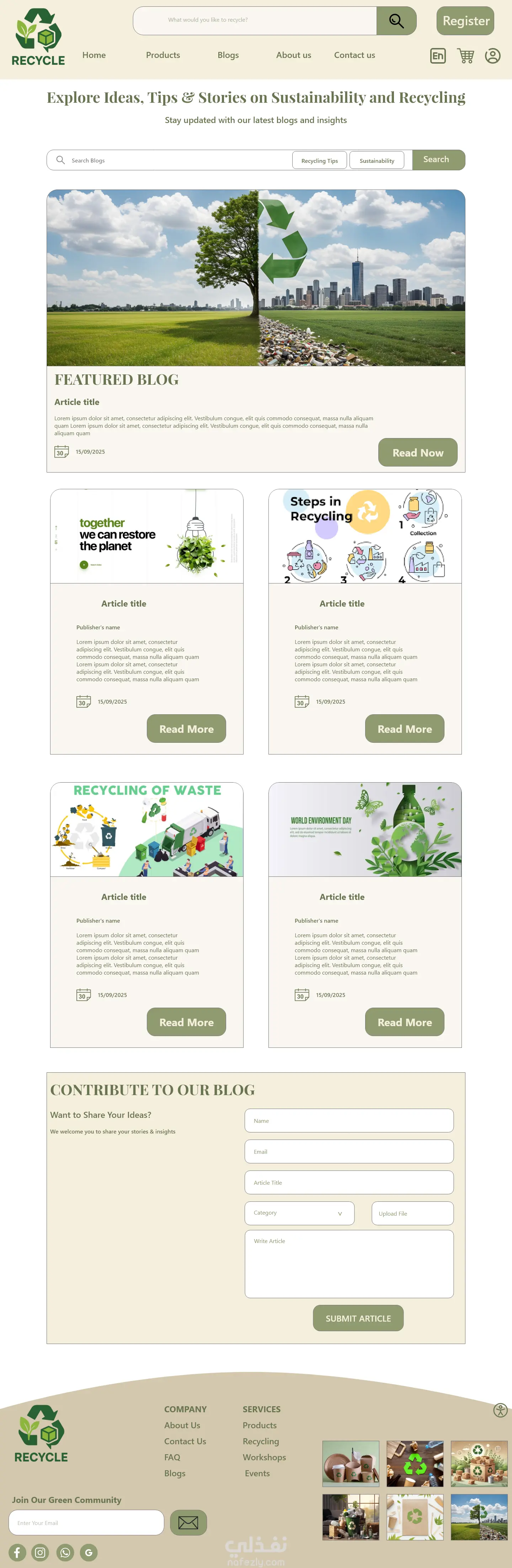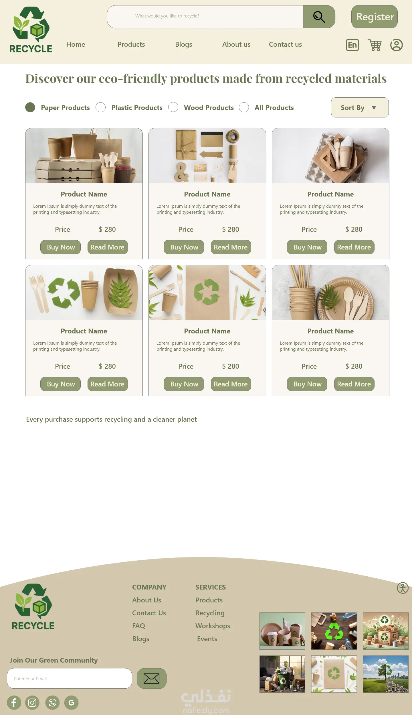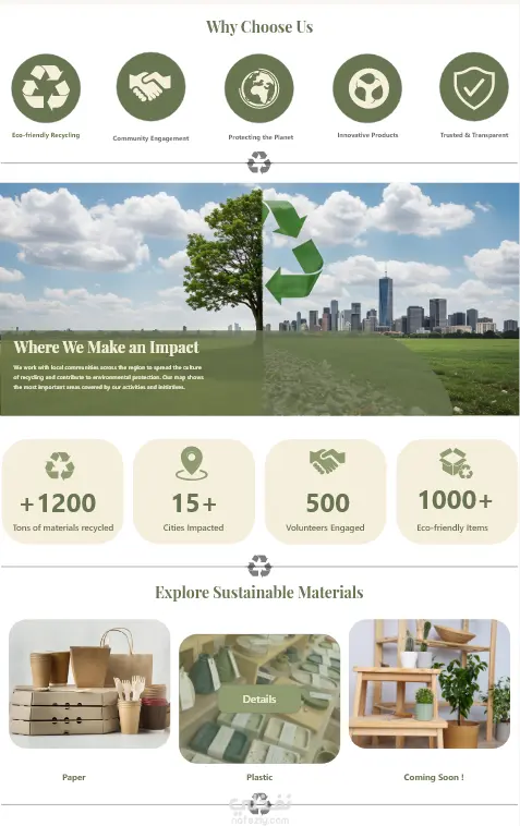موقع إلكتروني متكامل لشركة متخصصة في إعادة تدوير المواد مثل الورق والبلاستيك. يهدف التصميم إلى نشر الوعي البيئي وتشجيع المستخدمين على المشاركة من خلال التبرع بالمواد أو المساهمة المالية، مع إمكانية شراء منتجات معاد تدويرها عبر المنصة.