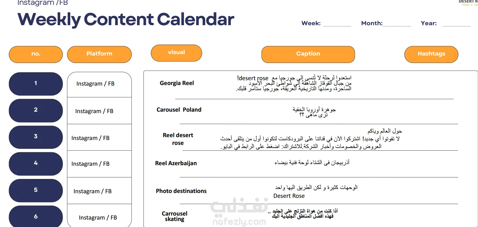 عمل كونتنت كاليندر او جدول محتوى يحتوى على الافكار و النص و مواعيد النشر و نصائح للمصمم تسهيلا للنشر بانتظام