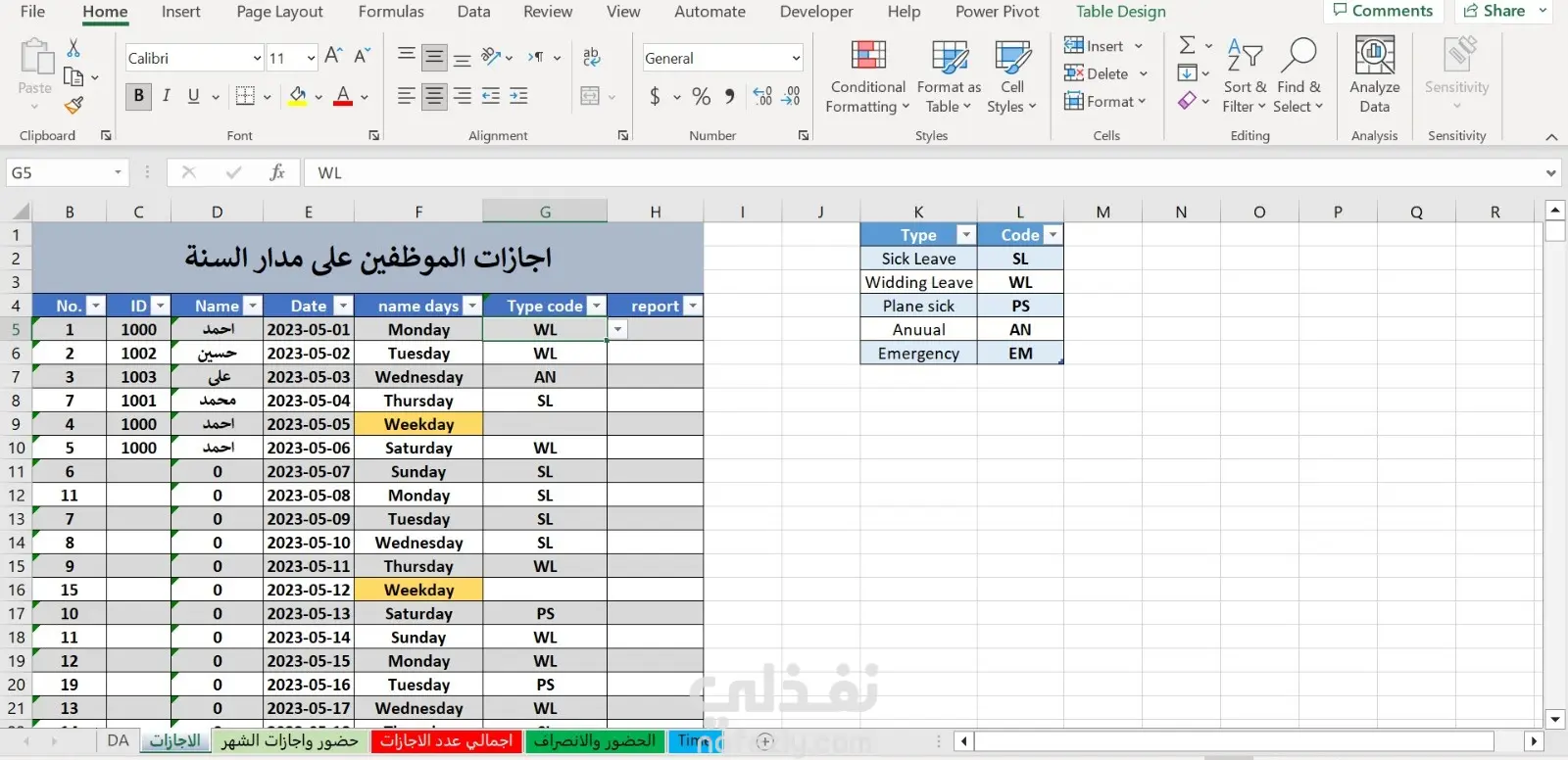 *شيت خاص بالاجازات الخاصة بالموظف ( السنوي - المرضي - الزواج - الطوارئ)