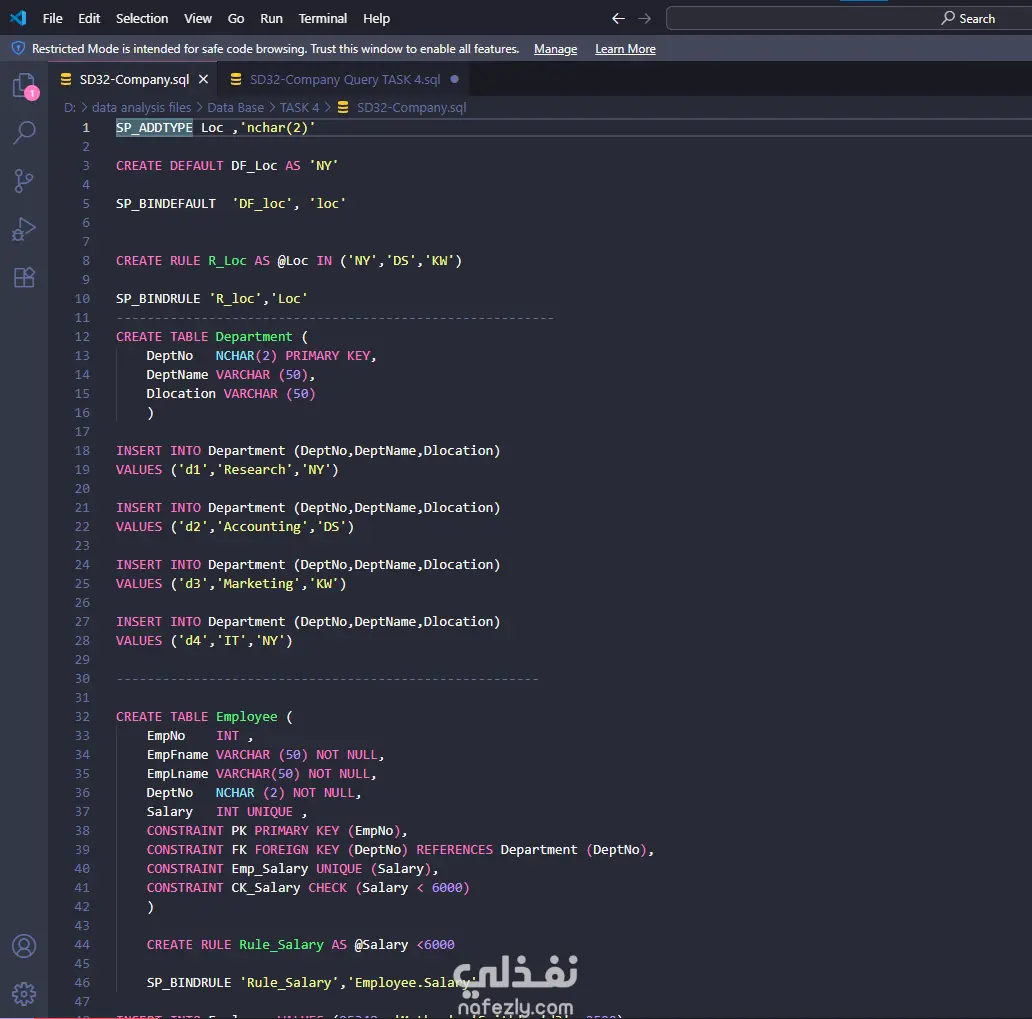 I created data base named SD32-company with some queries CREAT,INSERT,CONSTRAINT
