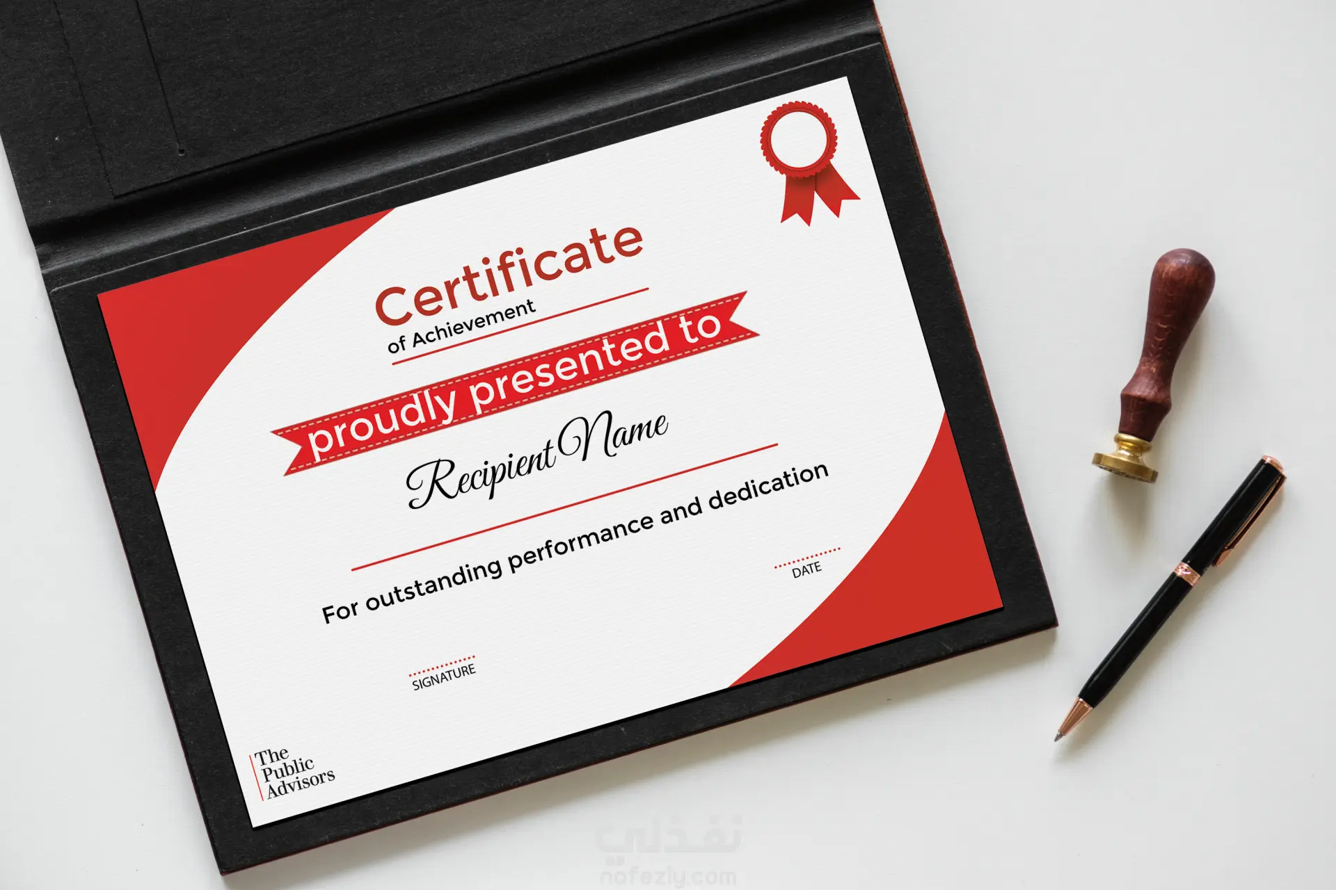 راح أصمملك شهادة تقدير بتصميم شيك واحترافي، وبألوان تتماشى مع ألوان البراند أو ألوانك المفضّلة.