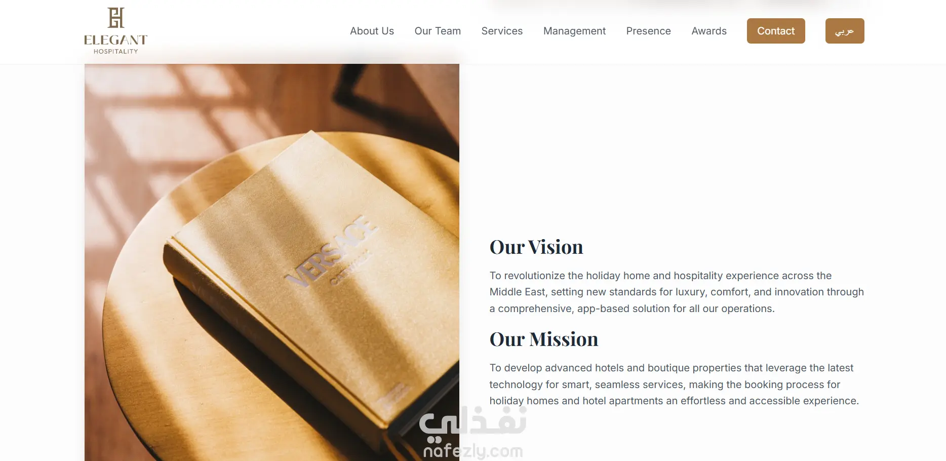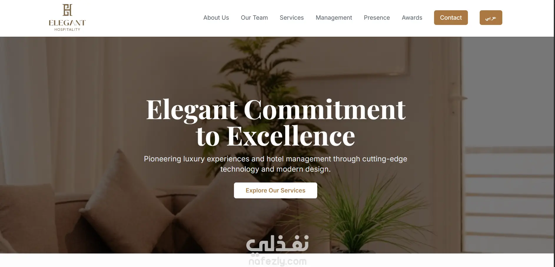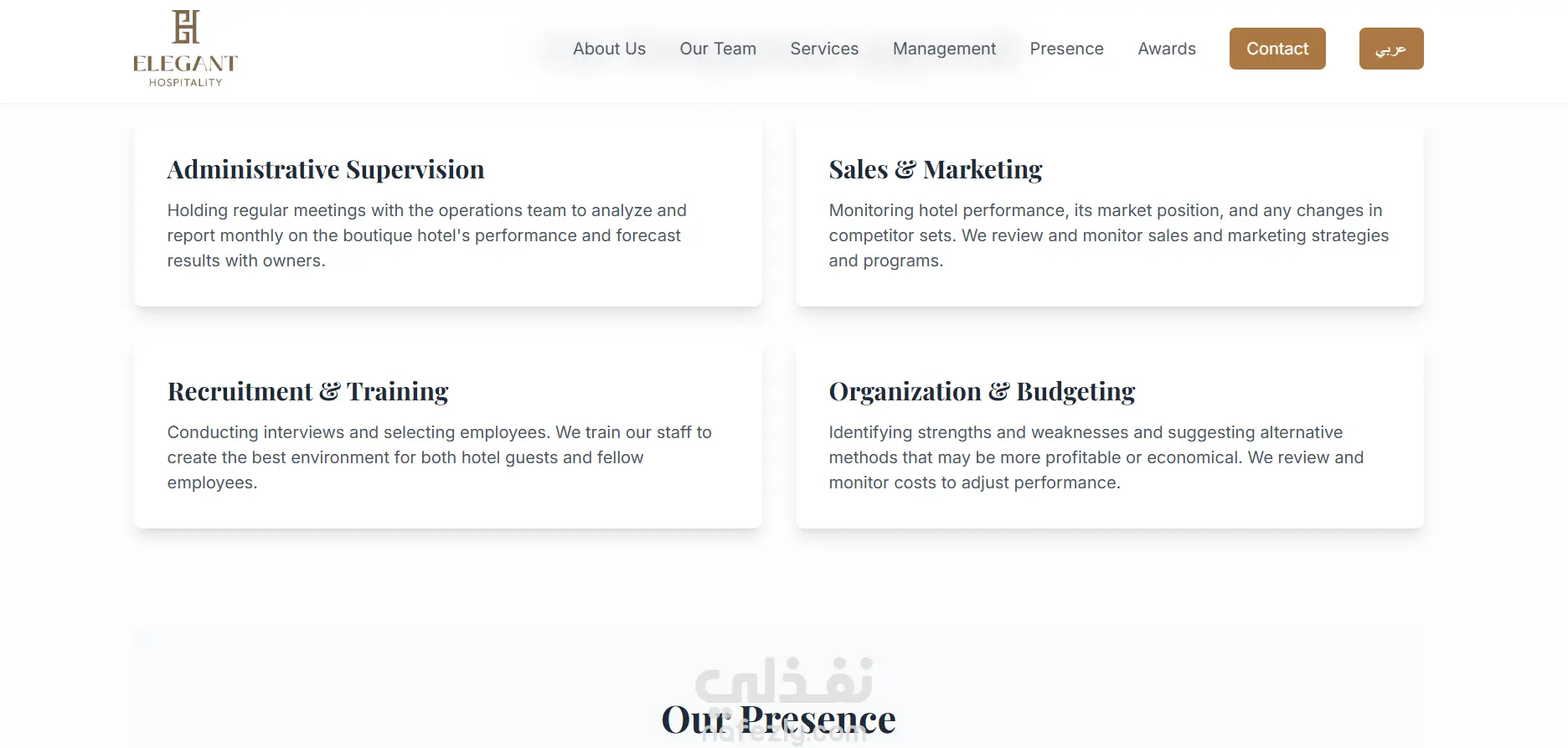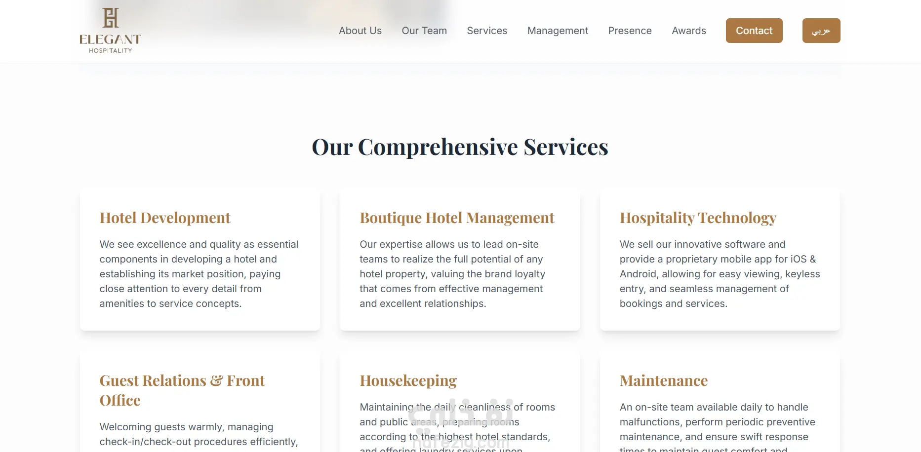 الموقع مكوّن من صفحة واحدة (One Page) تشمل أقسام: الرئيسية، الخدمات، الأعمال، العملاء، وطرق التواصل.