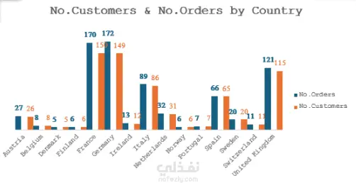 مقارنة بين عدد العملاء وعدد الطلبات حسب كل دولة لمعرفة الأسواق الأكثر نشاطًا.