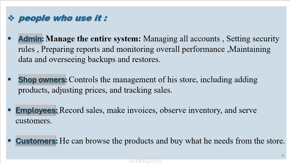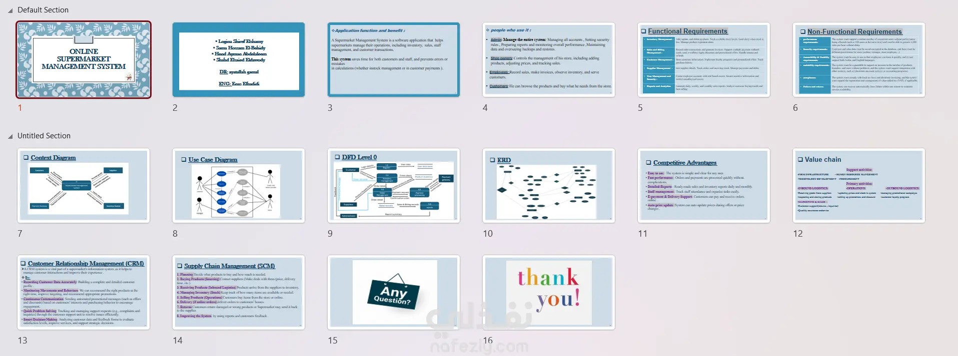 قمت بالمشاركة في إعداد عرض تقديمي لمشروع نظام "Online Supermarket" يهدف إلى تسهيل عملية التسوق عبر الإنترنت بطريقة منظمة وسهلة الاستخدام. يتناول العرض فكرة إنشاء منصة إلكترونية لإدارة متجر سوبر ماركت تشمل: تسجيل المستخدمين وإنشاء الحسابات. تصفح المنتجات وإضافتها إلى السلة. نظام لإتمام الطلبات والدفع أونلاين. لوحة تحكم لإدارة الأصناف والمخزون. ركزت في العرض على تنسيق الشرائح وتنظيم المعلومات بشكل واضح، مع استخدام تصميم بسيط وألوان متناسقة تعبر عن فكرة المشروع. كما تم توضيح مشكلة النظام التقليدي والحلول التي يقدمها النظام الإلكتروني بطريقة احترافية وسهلة الفهم. 🎯 الهدف من المشروع هو عرض فكرة تطبيق عملي يُحسّن تجربة التسوق ويجعلها أسرع وأكثر راحة للمستخدمين.