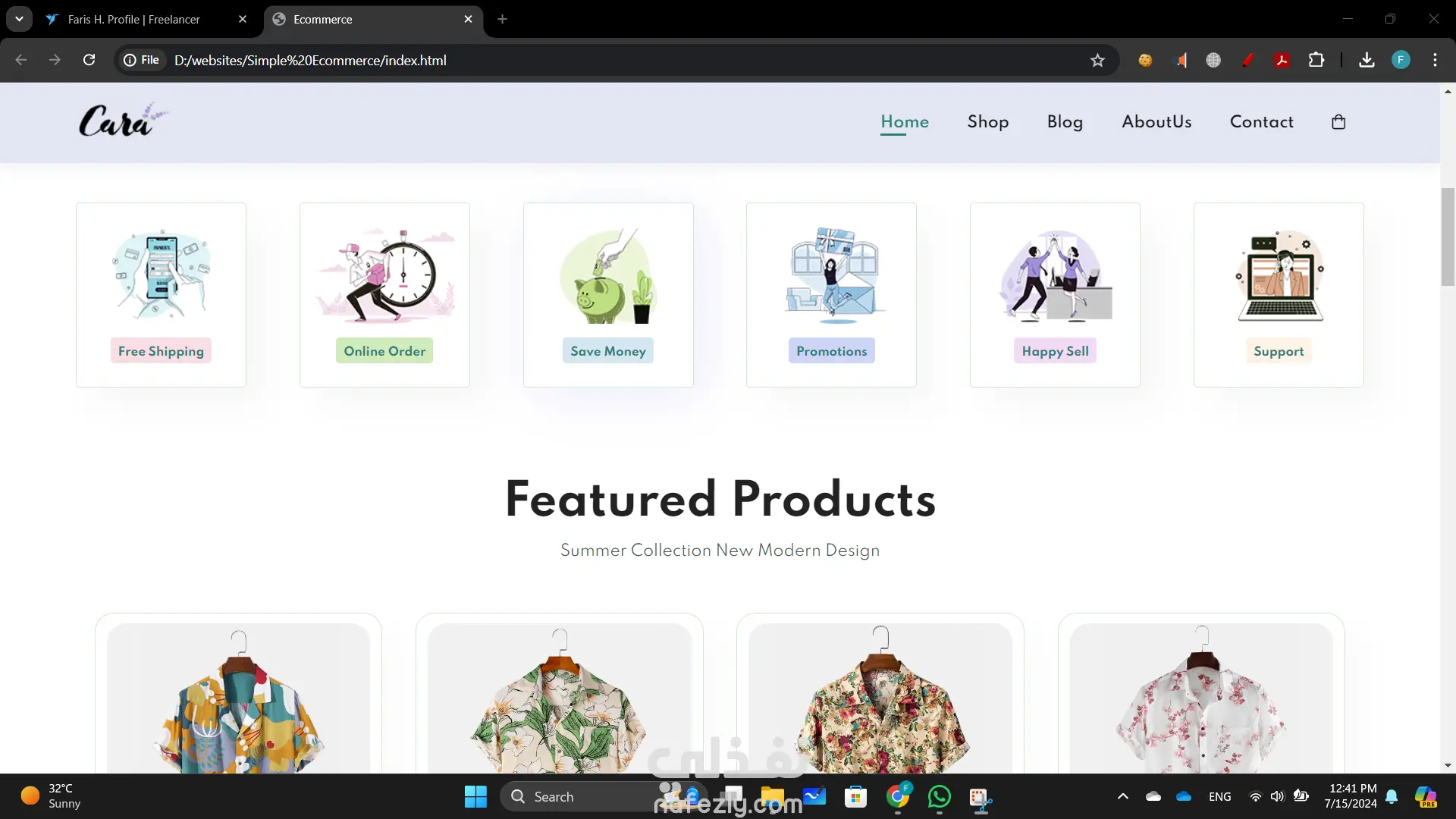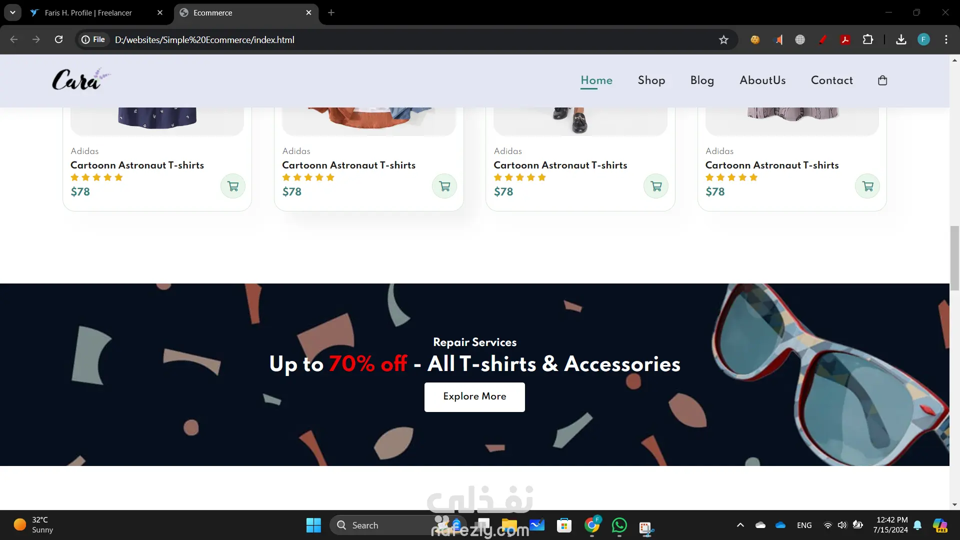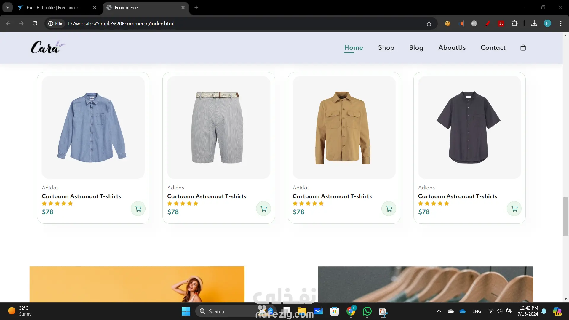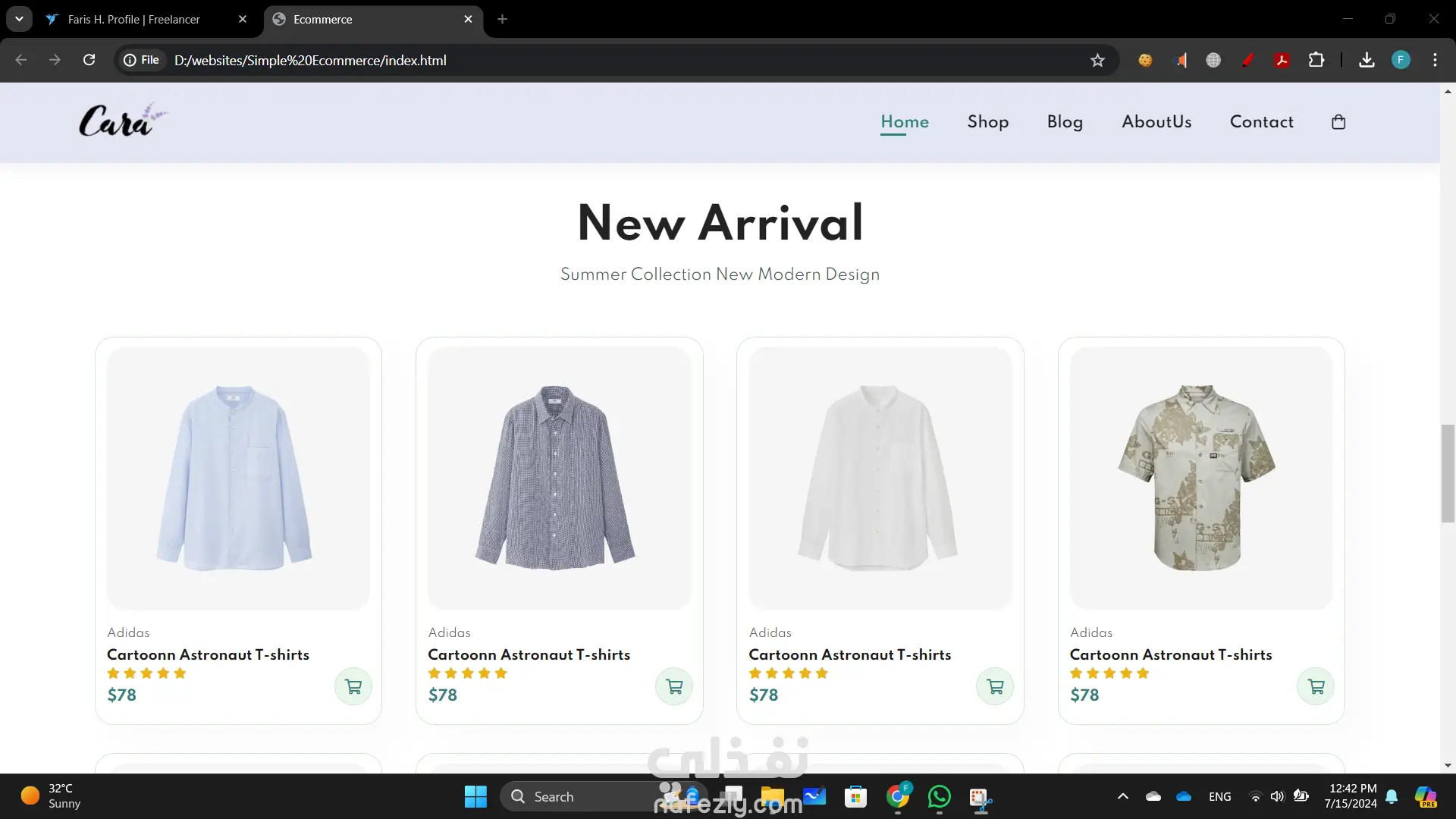 بناء موقع تجارة إلكترونية أنشأت موقع تجارة إلكترونية ديناميكي وسهل الاستخدام باستخدام HTML وCSS وJavaScript لتوفير تجربة تسوق سلسة. التصميم الأمامي ليس فقط جذاب بصريًا ولكنه أيضًا عالي الوظائف، مما يضمن رحلة مستخدم بديهية من تصفح المنتجات إلى إتمام الشراء. تشمل الميزات الرئيسية لهذا المشروع: تصميم متجاوب: الموقع متجاوب تمامًا، مما يوفر تجربة عرض مثالية عبر مختلف الأجهزة، من أجهزة الكمبيوتر المكتبية إلى الهواتف الذكية. واجهة مستخدم تفاعلية: استخدمت JavaScript لتحسين تفاعلات المستخدم، بما في ذلك معارض المنتجات الديناميكية، والتحقق من صحة النماذج في الوقت الحقيقي، ووظائف عربة التسوق التفاعلية. كود نظيف ومنظم: هيكل HTML هو دلالي ومنظم جيدًا، مما يجعل من السهل الصيانة والتوسع. CSS هو معياري ويتبع أفضل الممارسات للتصميم، مما يضمن التناسق وقابلية إعادة الاستخدام. تصميم يركز على المستخدم: ركزت على إنشاء واجهة جذابة وسهلة التنقل، مع دعوات واضحة للعمل وعناصر تصميم سهلة الوصول.