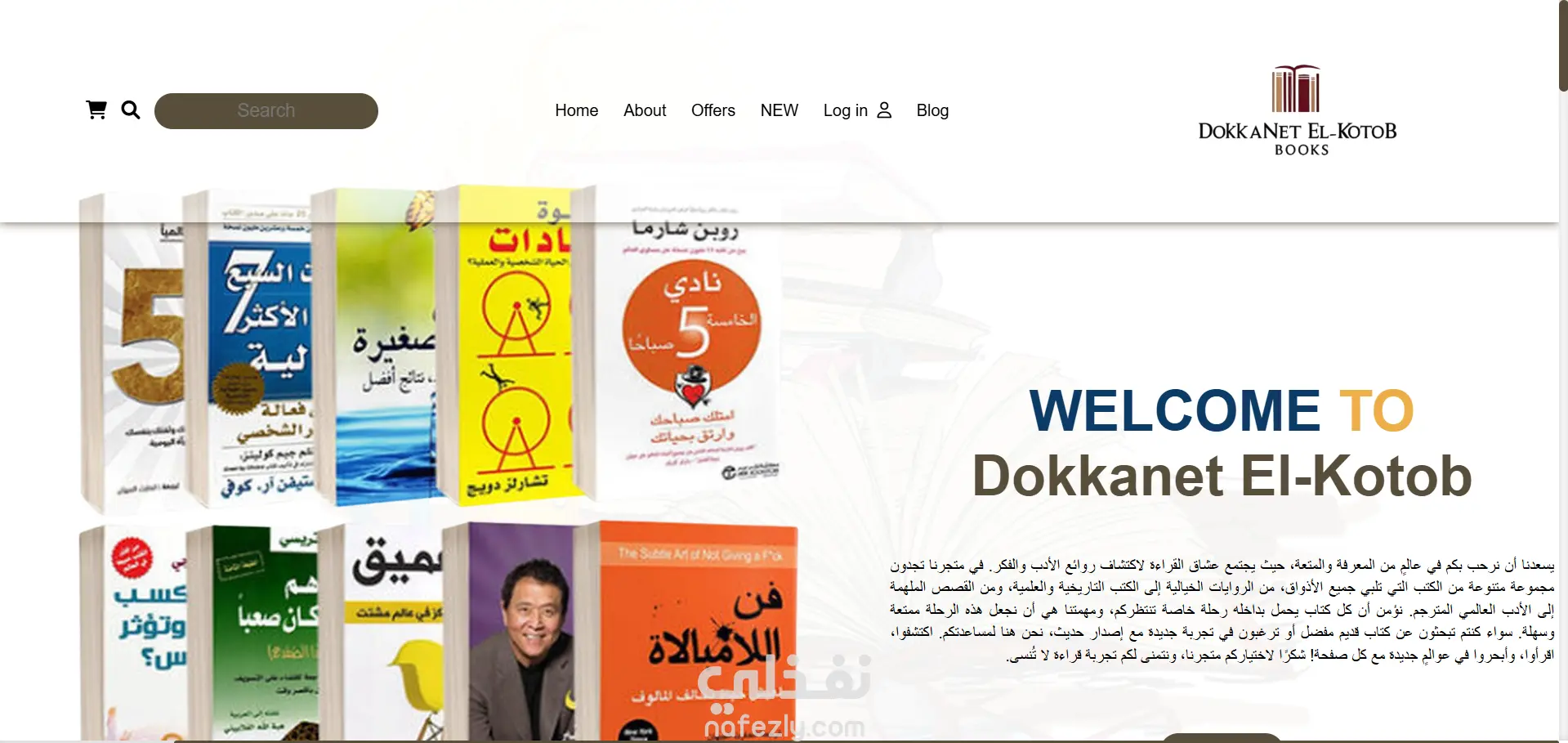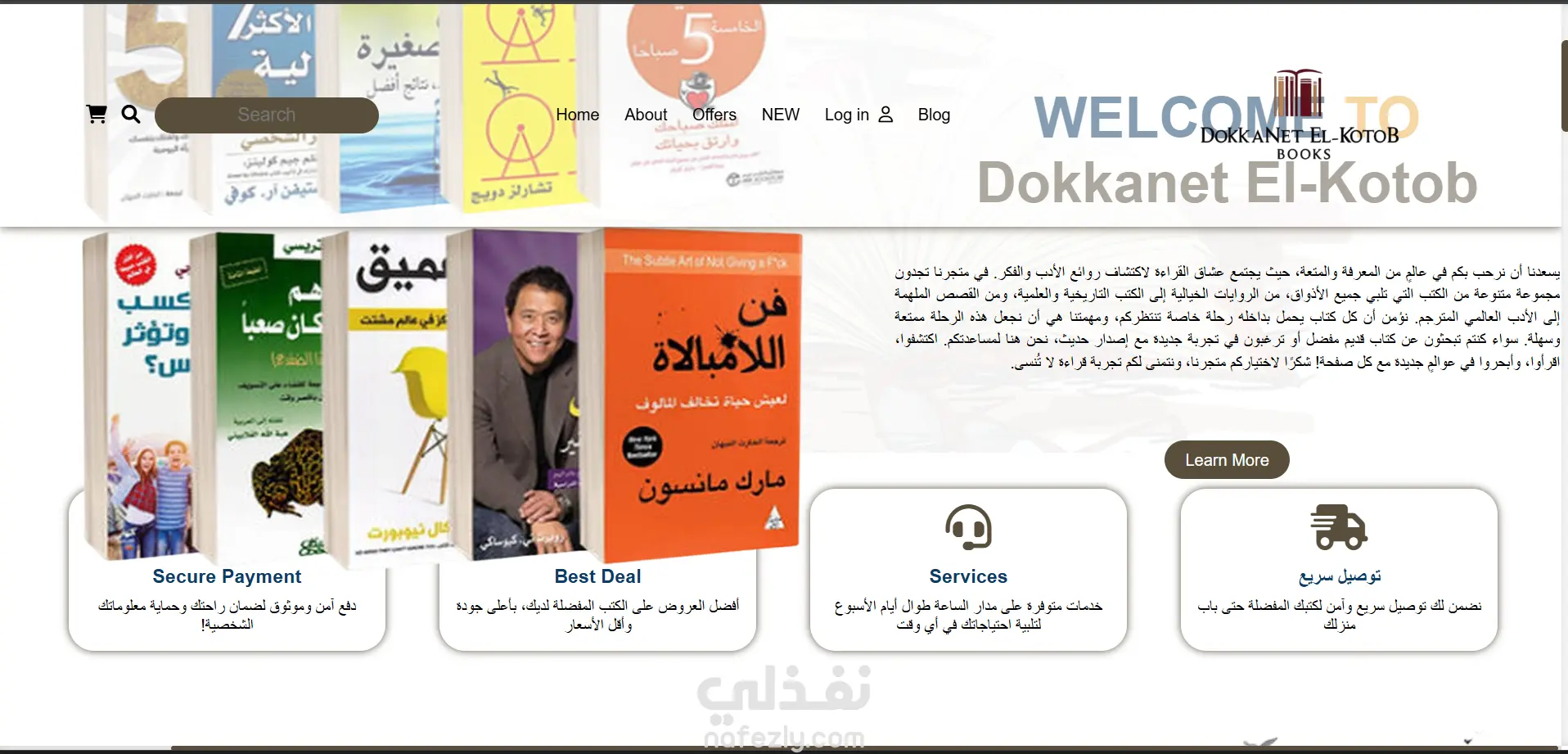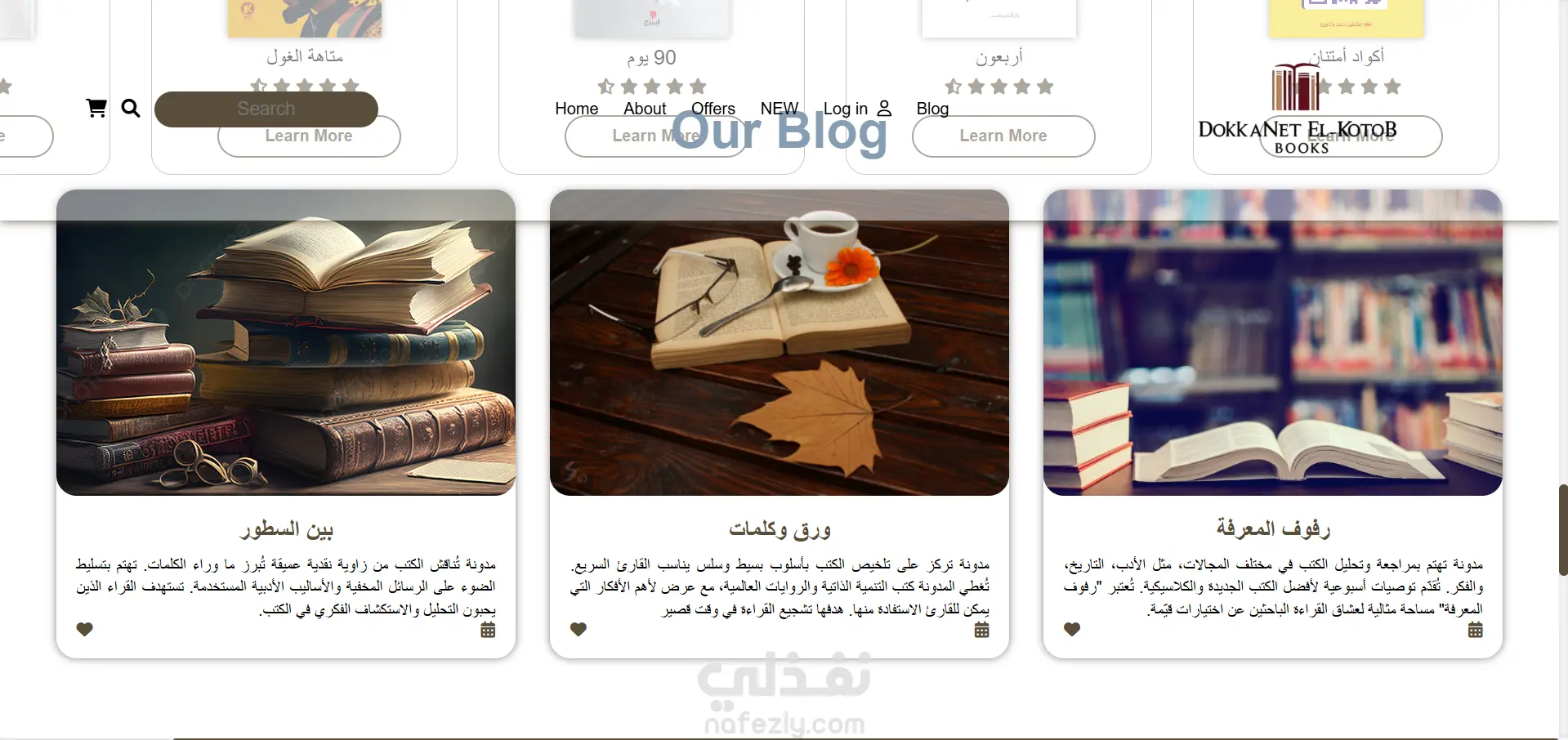 الموقع يحتوي على صفحات متعددة مثل الصفحة الرئيسية، من نحن، العروض، والمدونة، ويعرض الكتب بطريقة منظمة وجذابة.