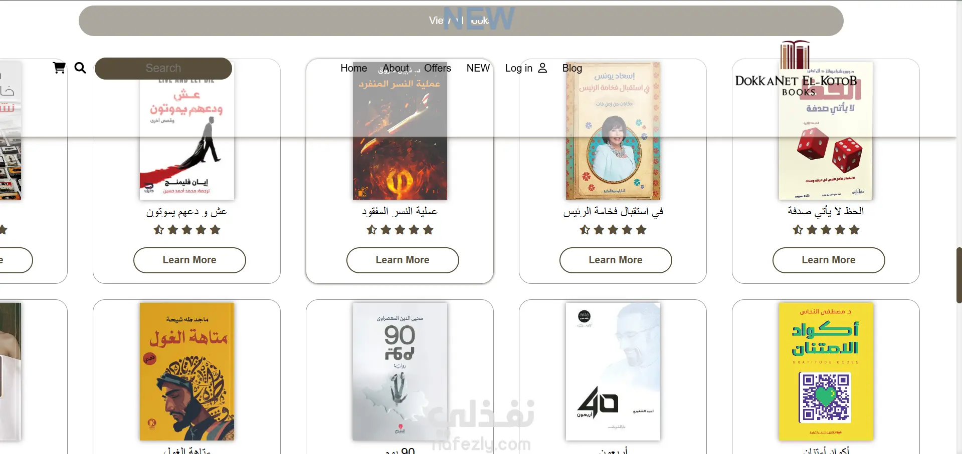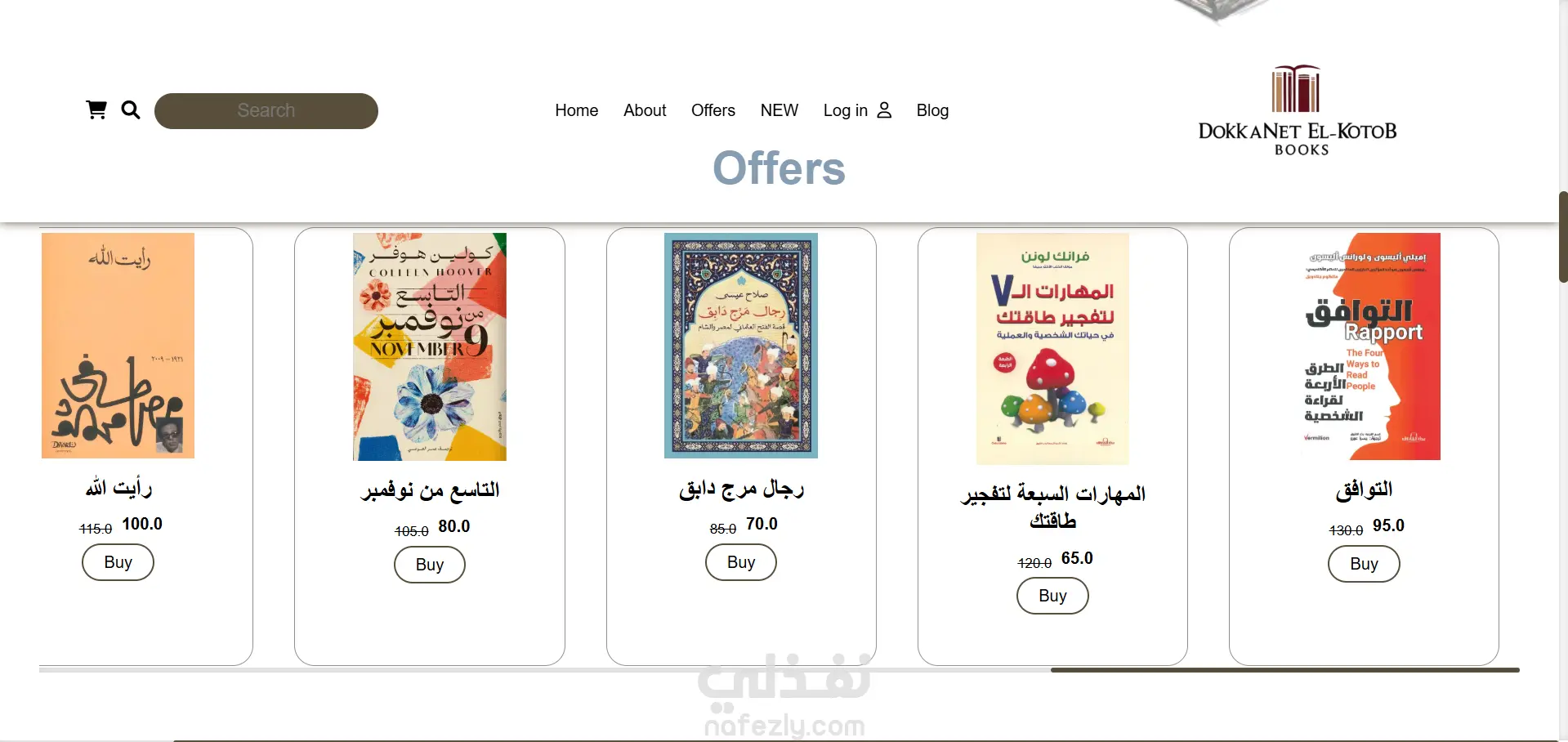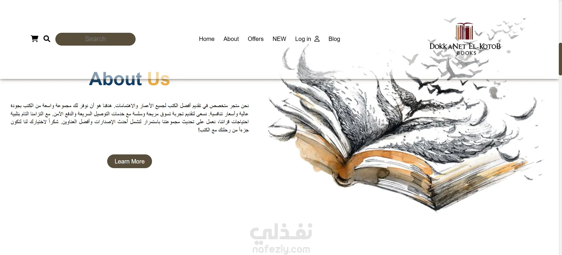 الموقع يحتوي على صفحات متعددة مثل الصفحة الرئيسية، من نحن، العروض، والمدونة، ويعرض الكتب بطريقة منظمة وجذابة.