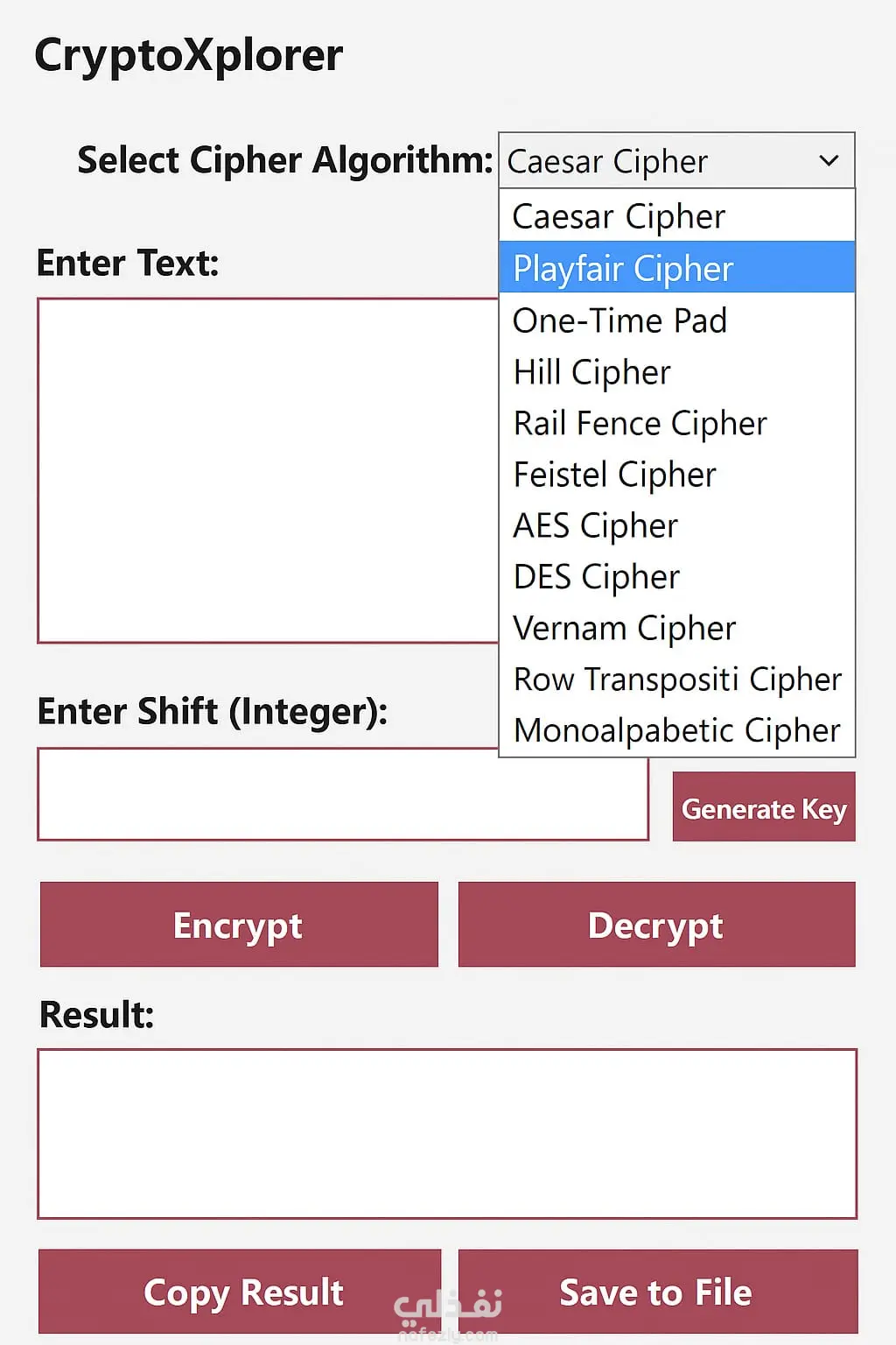 التطبيق يتيح للمستخدم اختيار خوارزمية التشفير المناسبة مثل Caesar Cipher، Vigenère Cipher، AES، وغيرها، مع إمكانية التشفير وفك التشفير بسهولة من خلال واجهة رسومية بسيطة وواضحة.