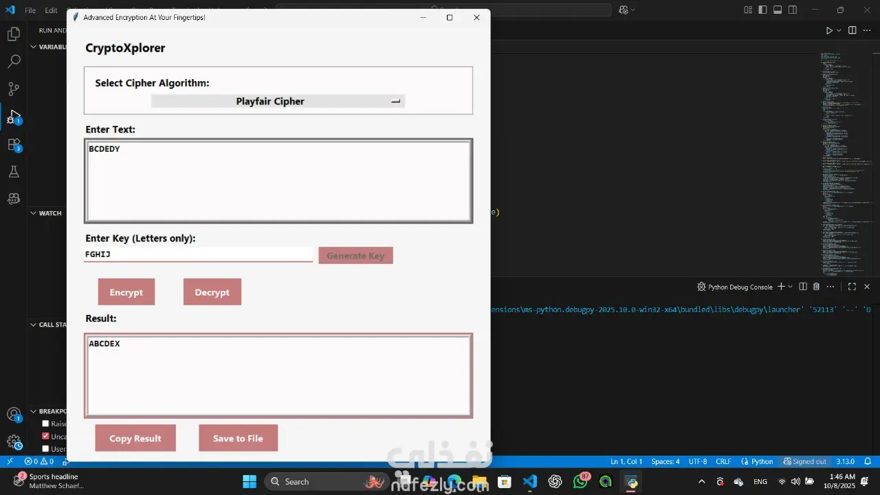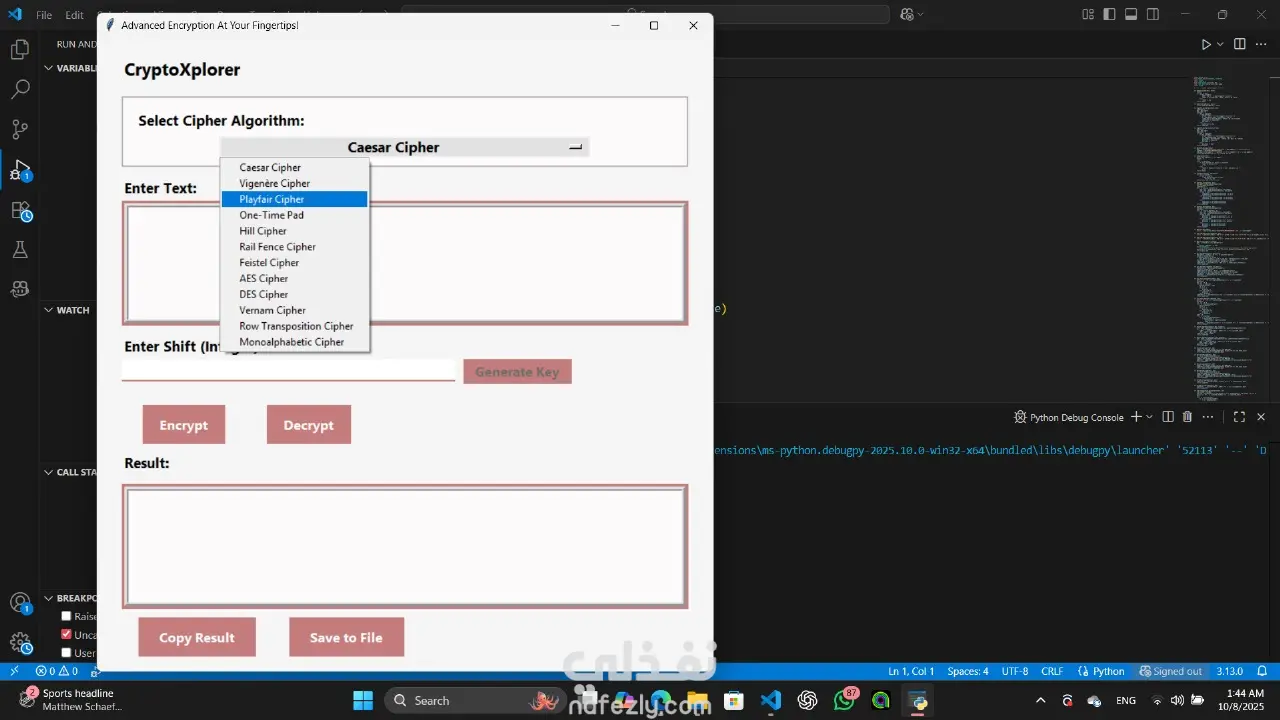 عملت على مشروع لتطبيق تشفير متعدد الخوارزميات باستخدام لغة Python، باسم CryptoXplorer.