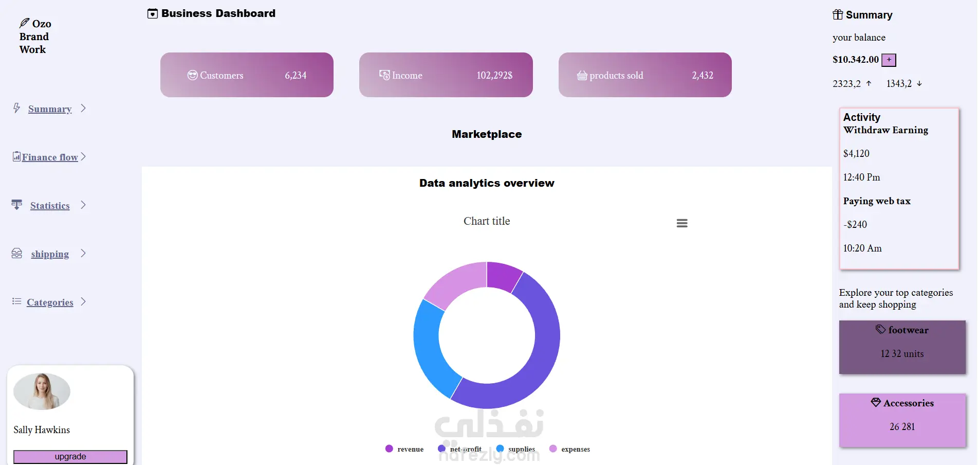 تتيح الواجهة للمستخدمين متابعة مؤشرات الأداء الرئيسية مثل عدد العملاء، الدخل، المنتجات المباعة، والإحصاءات المالية، وذلك من خلال عرض مرئي واضح وسهل الفهم عبر الرسوم البيانية والعناصر الإحصائية.