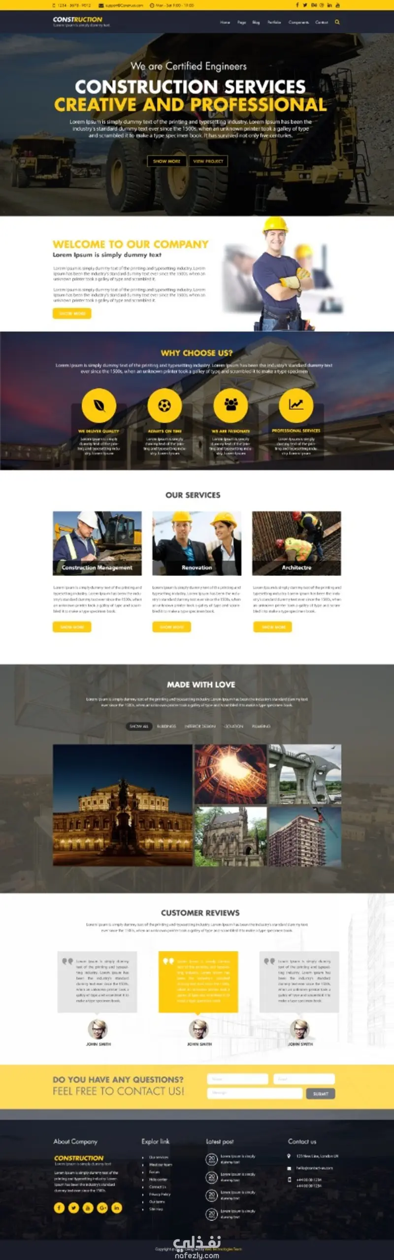 الموقع يعرض خدمات شركة إنشاءات بشكل احترافي، ويحتوي على أقسام متعددة مثل التعريف بالشركة، الخدمات، المشاريع، آراء العملاء، ونموذج التواصل. تم التركيز على تنسيق العناصر، اختيار الألوان المناسبة، وترتيب المحتوى بطريقة تسهّل التصفح وتعكس هوية الشركةومتجاوبة مع جميع الشاشات.