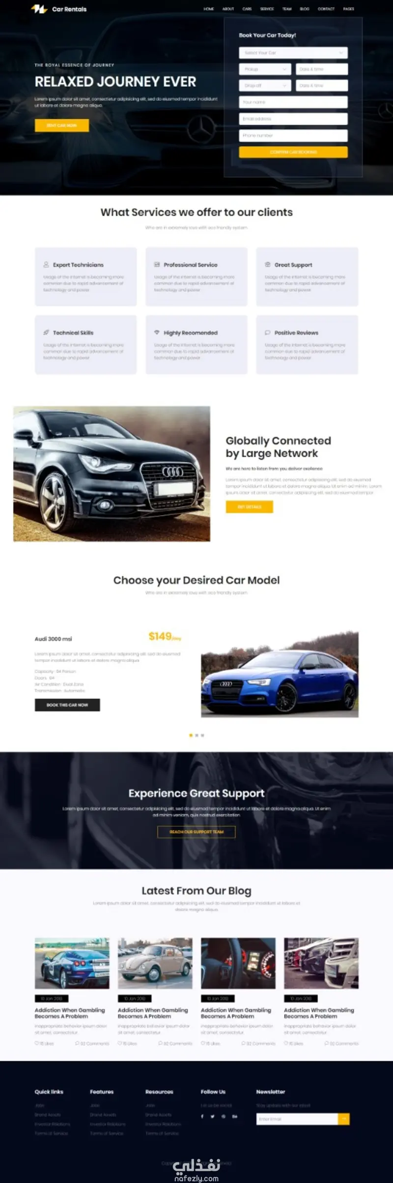 تم تصميم وتطوير موقع إلكتروني متكامل لخدمات تأجير السيارات، يتميز بتصميم عصري ونظيف يركز على سهولة الاستخدام وتجربة العميل. يحتوي الموقع على نموذج حجز مباشر، عرض لخدمات الشركة، سيارات متاحة للإيجار، مدونة، ومعلومات تواصل، مما يجعله مثاليًا لجذب العملاء وتسهيل عملية الحجز.