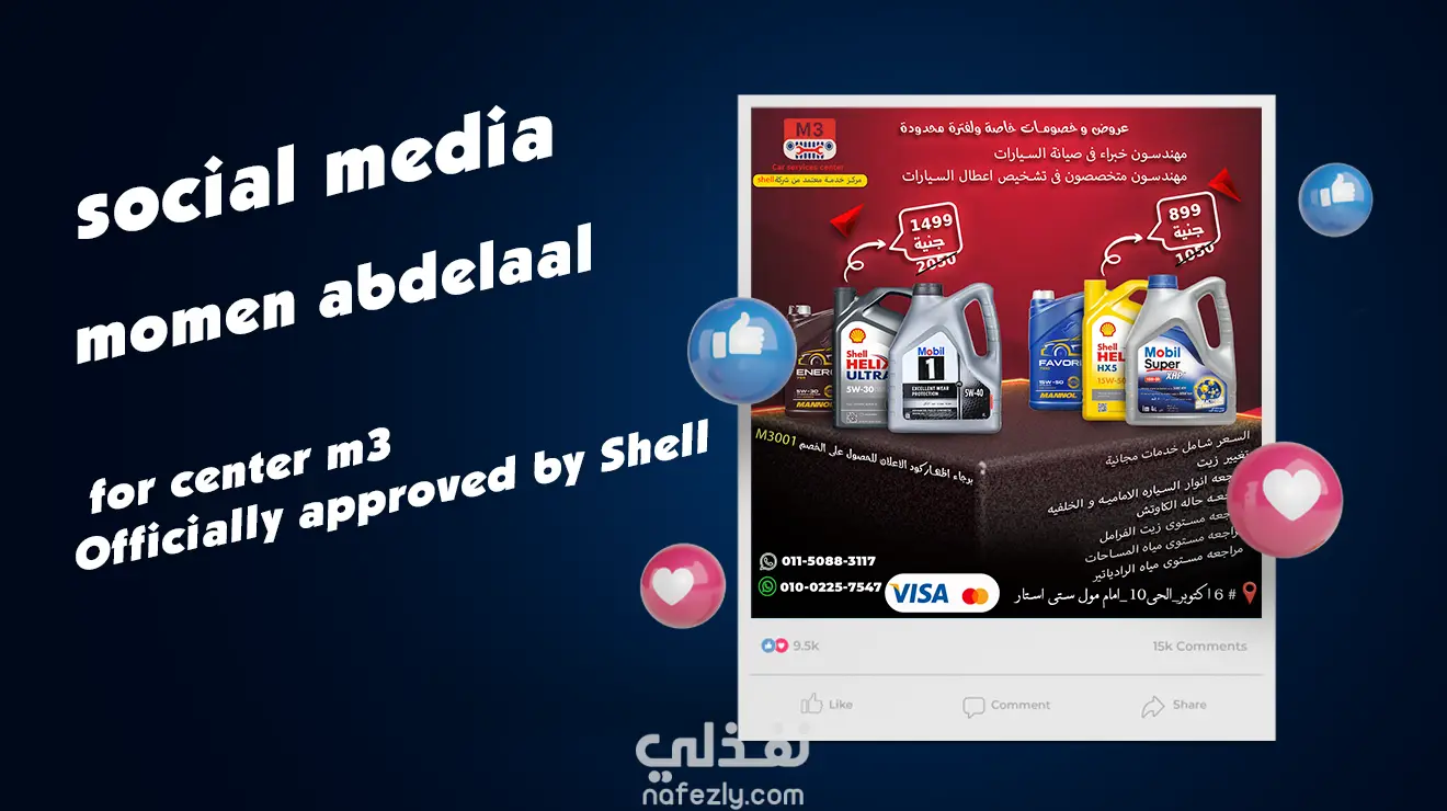 مت بتصميم مجموعة من الإعلانات الدعائية والترويجية لتوكيل شركة زيوت Shell، تم التركيز فيها على إبراز جودة المنتجات وخدمات الصيانة بطريقة عصرية وجذابة.