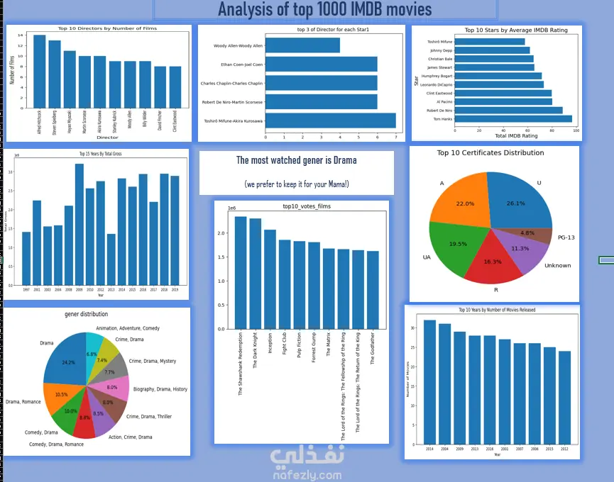 في هذا المشروع قمت بتحليل بيانات أفضل 1000 فيلم على موقع IMDB بهدف استخراج الأنماط والاتجاهات في صناعة السينما العالمية. شمل التحليل: أكثر 10 مخرجين قاموا بإخراج أكبر عدد من الأفلام. أفضل 10 نجوم من حيث متوسط التقييمات. تحليل توزيع الأنواع (Genres) للأفلام الأكثر شهرة. استكشاف توزيع شهادات العرض (Certificates). رصد أكثر السنوات التي تم فيها إصدار أفلام ناجحة. مقارنة الأفلام حسب إجمالي الإيرادات وعدد الأصوات. تم تنفيذ التحليل باستخدام Python (Pandas & Matplotlib) لتهيئة البيانات وإنشاء الرسوم البيانية، بالإضافة إلى إعداد Dashboard شامل لعرض النتائج بطريقة مرئية تساعد في تبسيط الرؤى. النتيجة النهائية كانت لوحة تحليلية توضح أهم اتجاهات السينما العالمية مثل سيطرة نوع الدراما على معظم الأفلام، وبروز مخرجين ونجوم مؤثرين في تاريخ السينما.
