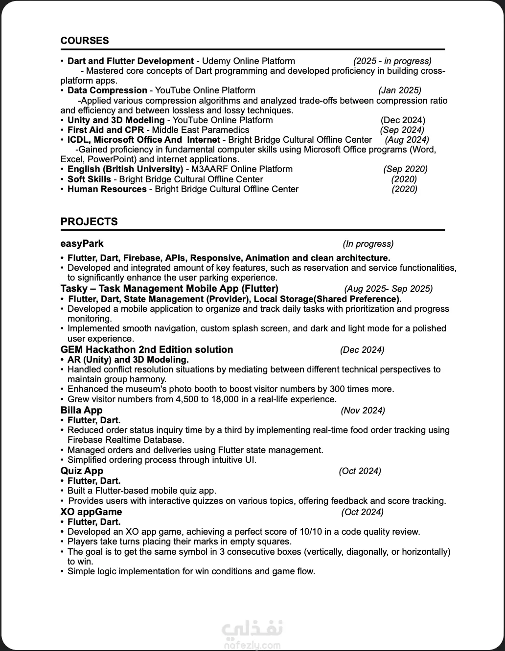عمل سيرة ذاتية باللغة العربية أو الانجليزية بشكل يدوي بالكامل دون استخدام أدوات الذكاء الاصطناعي أو استخدام أي templete جاهز، فقط باستخدام برنامج وورد اوفيس، و ذلك لجعله متوافق مع أنظمة الATS، إذ في الوقت الحالي أصبح استخدام هذه الأنظمة مرحلة أساسية من مراحل تقييم السير الذاتية المقدمة و ذلك قبل عرضها على صاحب العمل. لدي خبرة في كتابة السير الذاتية و كلها بحمد الله تحصل على Score A على أنظمة ال ATS. كما لدي خبرة في البحث عن الكلمات المفتاحية للوظيفة المتقدم إليها و إضافتها في السيرة الذاتية و ذلك لرفع معدل تناسبها مع أنظمة ال ats الخاصة. تسليم صيغة .docx و صيغة أخرى .pdf مع إمكانية طلب تعديلات خلال يوم بعد إتمام عملية التسليم.