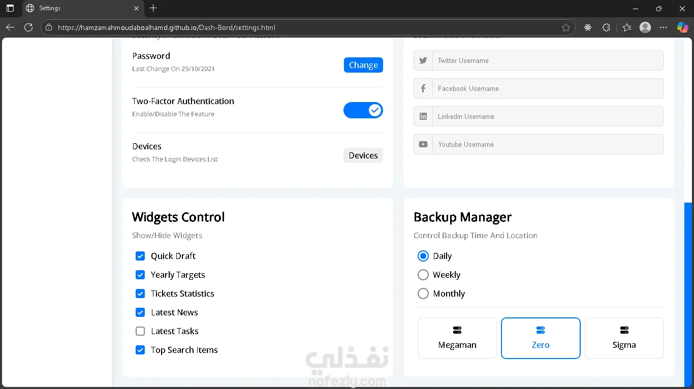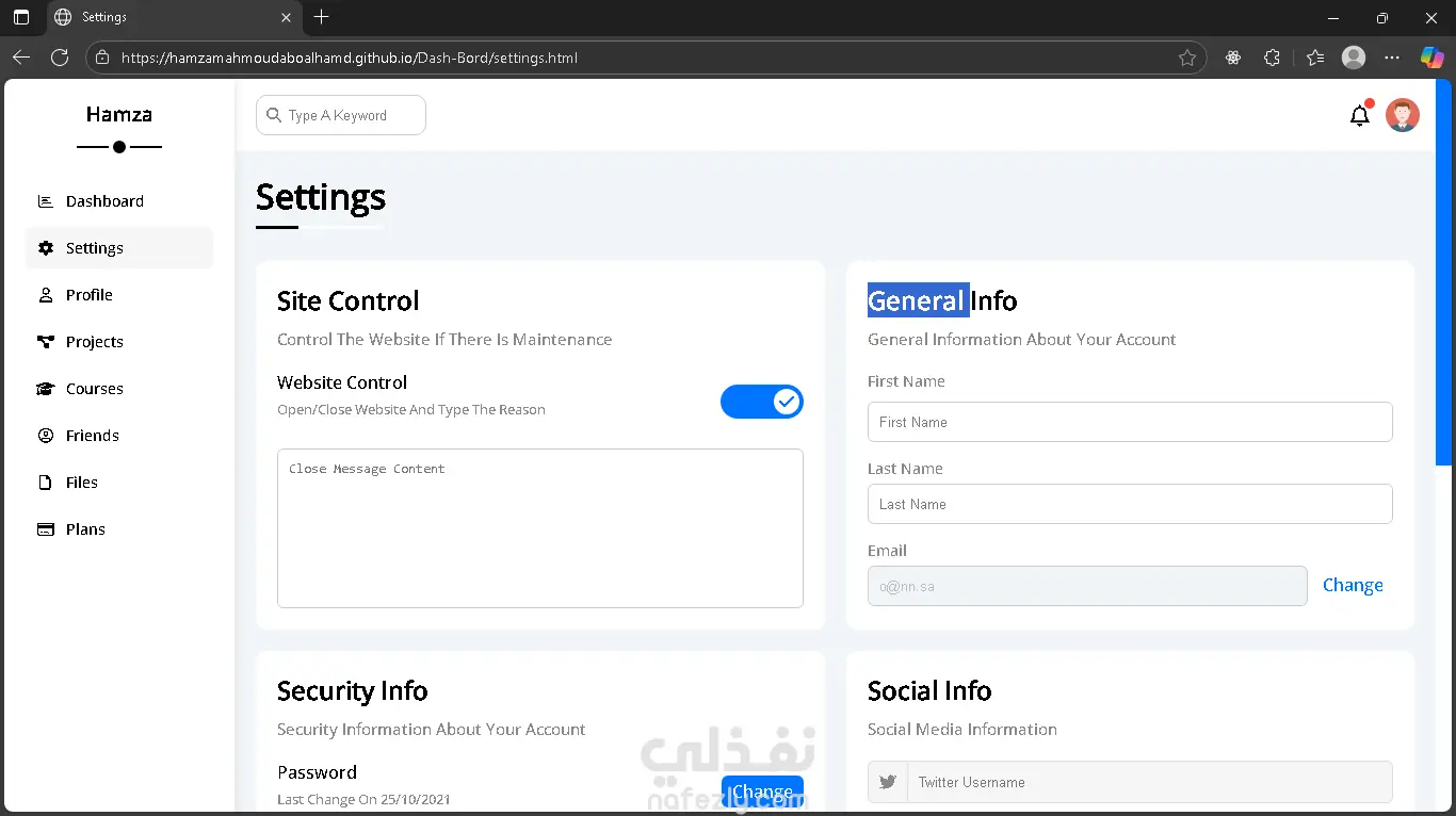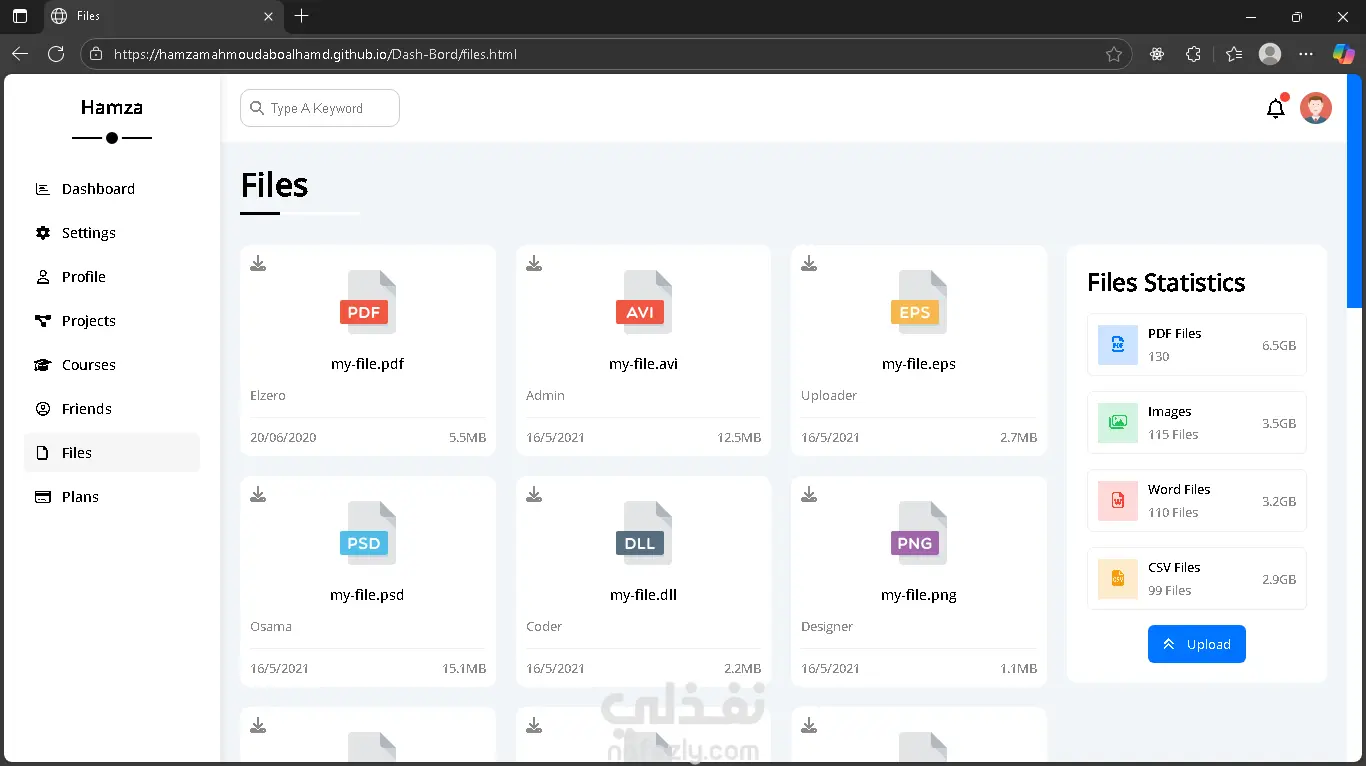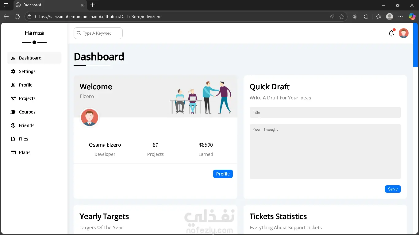 قمت بتطوير لوحة تحكم (Admin Dashboard) كاملة ومتكاملة تحتوي على عدة صفحات، بتصميم منظم، وأسلوب احترافي مناسب لإدارة الأنظمة والمواقع والمنصات. اللوحة تم بناؤها من الصفر باستخدام HTML، CSS، وVanilla JavaScript، مع اعتماد أسلوب Responsive Design لتعمل على جميع الشاشات. المشروع يشمل صفحات مختلفة مثل الرئيسية، الملفات، الكورسات، الأصدقاء، الإعدادات، الخطط، المشاريع، الصفحة الشخصية وغيرها — مع واجهة استخدام واضحة وسهلة. اللوحة مناسبة كقالب Dashboard جاهز يمكن تخصيصه وربطه بباك-إند لأي نظام أو شركة. المميزات (Features) تصميم احترافي متعدد الصفحات واجهة Dashboard كاملة وسهلة الاستخدام Sidebar + Header متفاعلان نظام Widgets منسق لعرض المعلومات صفحة Profile كاملة صفحة Settings مع عناصر Editable صفحة Projects لعرض المشاريع بشكل منظم صفحة Files لعرض الملفات والإحصائيات صفحة Courses لعرض الدورات صفحة Friends قائمة بالكامل تصميم متجاوب على جميع الأجهزة إمكانية الإضافة أو التعديل بسهولة كود نظيف ومنظم وسهل الفهم ️ التقنيات المستخدمة (Technologies) HTML5 CSS3 JavaScript (Vanilla) Responsive Layout Webfonts Google Icons عدد الصفحات في المشروع Home Courses Files Friends Projects Plans Profile Settings Index (إجمالي: 9 صفحات كاملة)