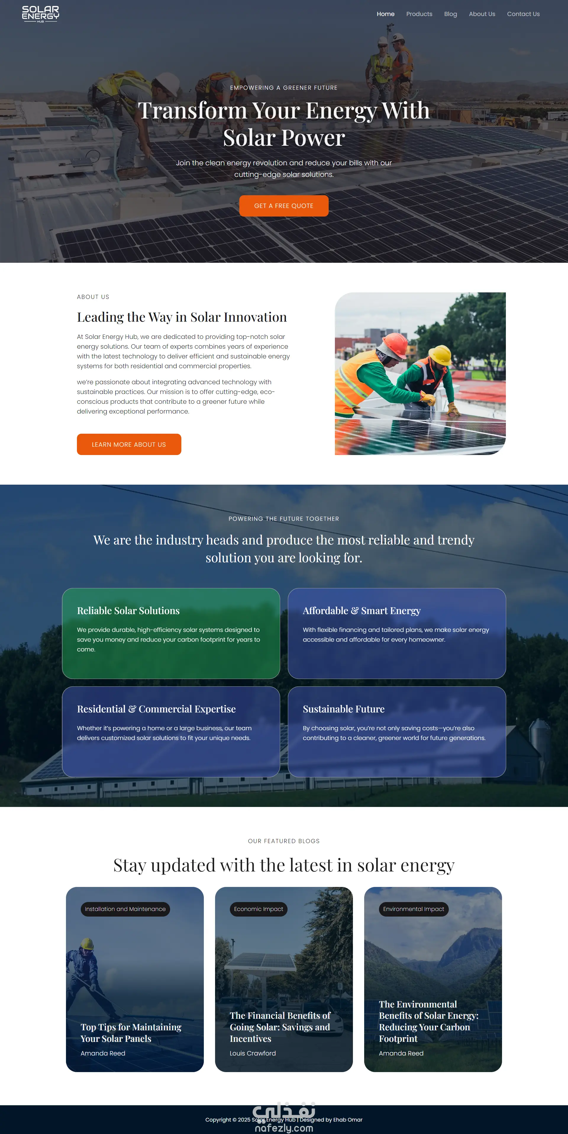 تطوير موقع متكامل يعكس هوية الشركة ويعرض خدماتها ومشروعاتها في مجال الطاقة الشمسية بأسلوب حديث وسهل الاستخدام، مع تحسين الأداء وتجربة المستخدم.