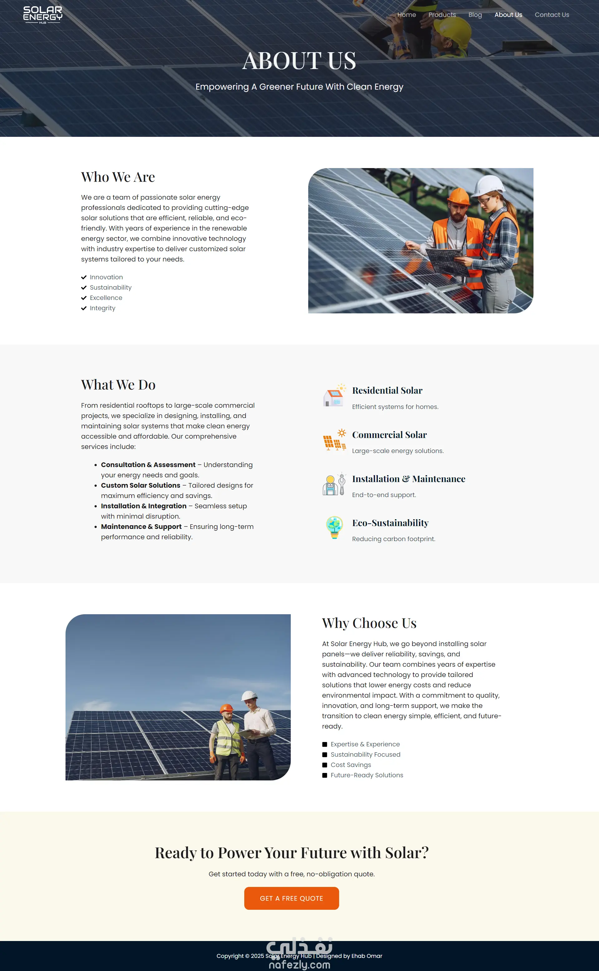 تطوير صفحة من نحن (About Us) التي توضح رؤية الشركة ورسالتها في مجال الطاقة المستدامة.