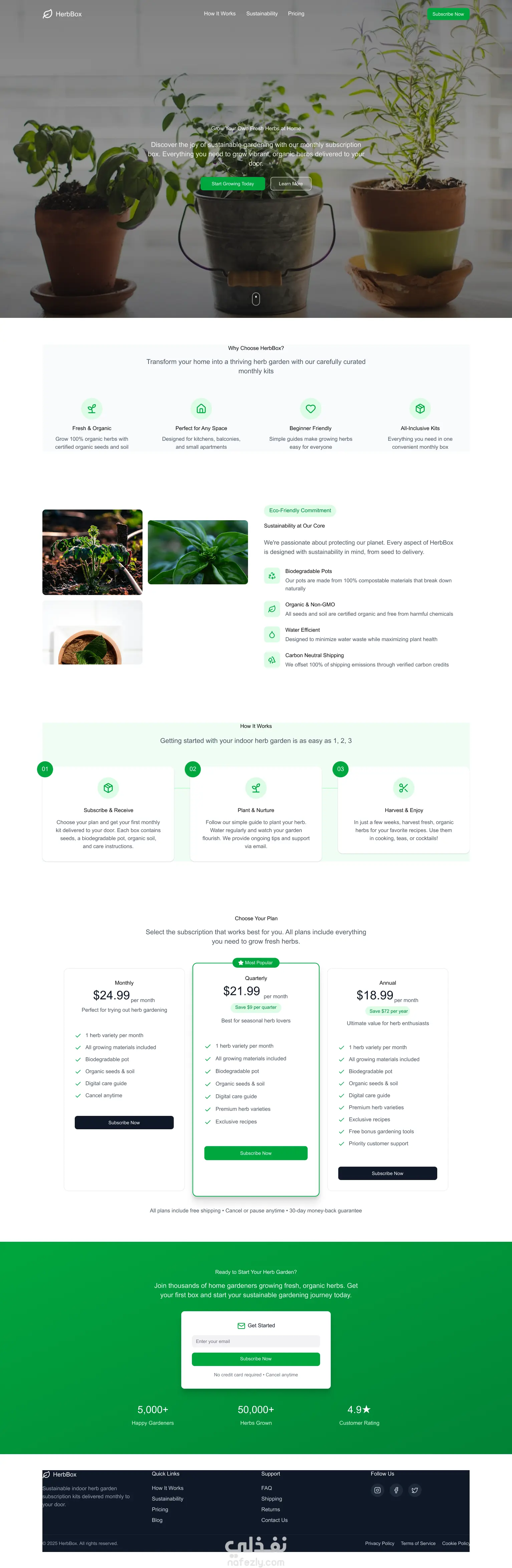 مشروع تجارة إلكترونية بيقدّم اشتراك شهري بيوصل للعميل مجموعة كاملة لزراعة نوع محدد من الأعشاب كل شهر (بذور، أصيص قابل للتحلل، تربة عضوية، ودليل بسيط). الهدف من الصفحة هو تشجيع الزائرين على الاشتراك الشهري.
