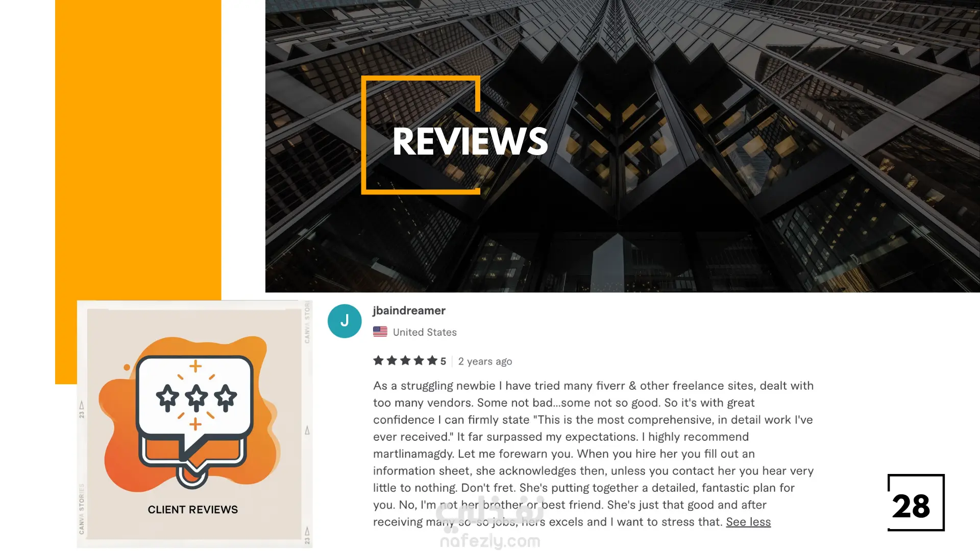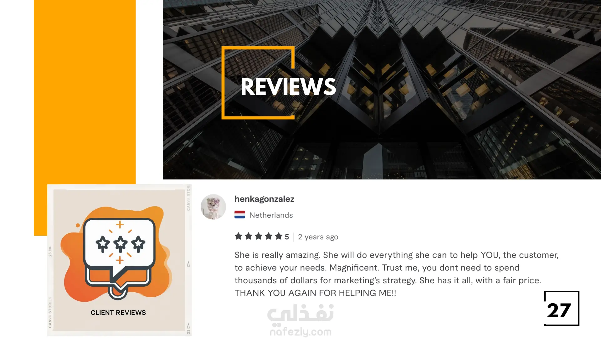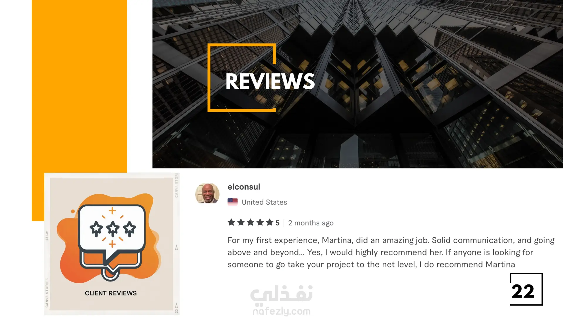هذا الملف يمثل مجموعة من التقييمات التي تلقيتها من عملائي على منصات العمل الحر المختلفة، بعد إتمام مشاريعهم بنجاح. اخترت هذه التقييمات لتسليط الضوء على أبرز الميزات في منهجيّة العمل.