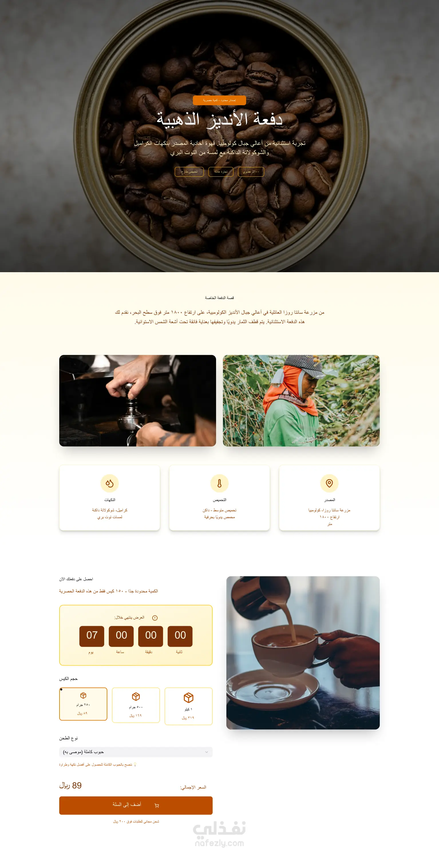 محمصة قهوة صغيرة متخصصة في أنواع نادرة من البن أحادي المصدر. بيقدموا عرض محدود لدفعة جديدة من خليط خاص وحصري. الهدف من الصفحة هو دفع الزوار للشراء فورًا.