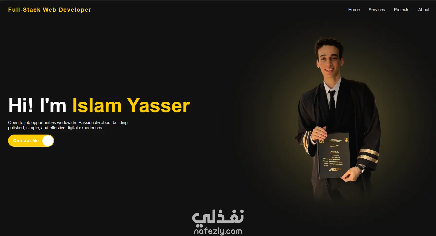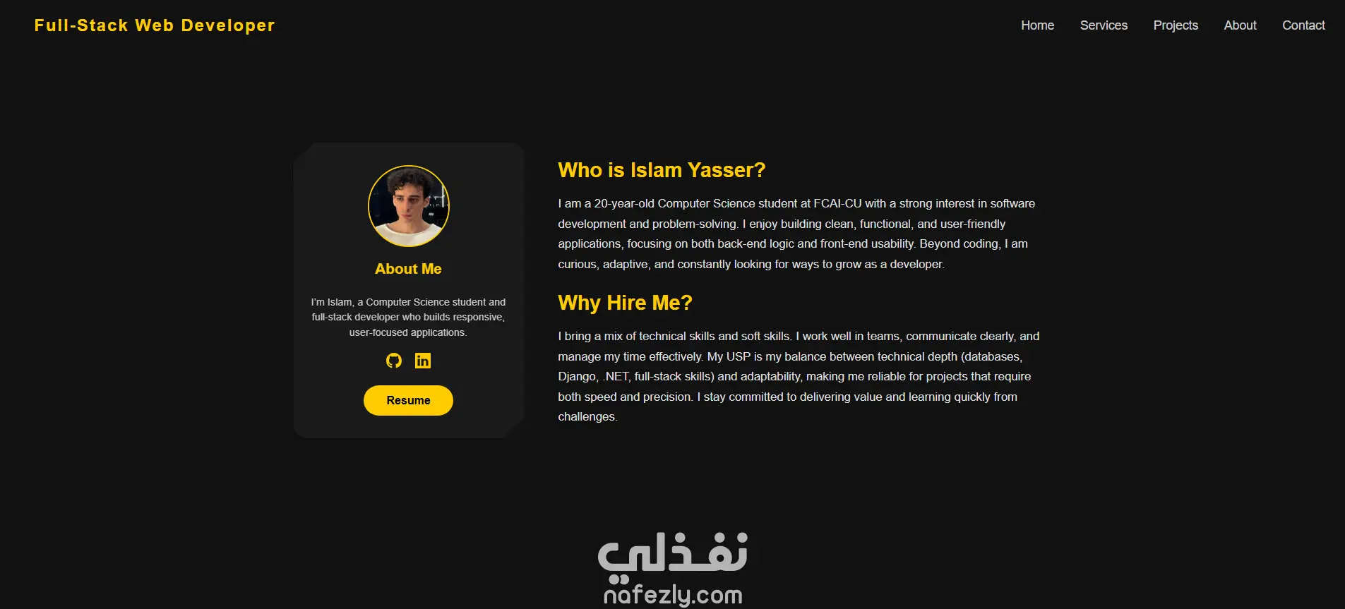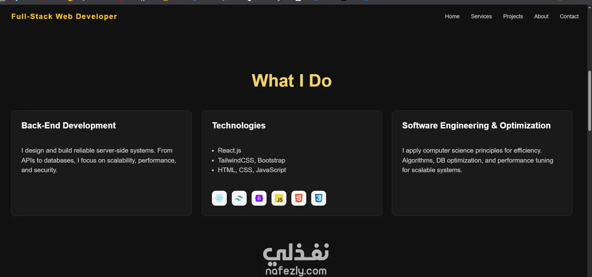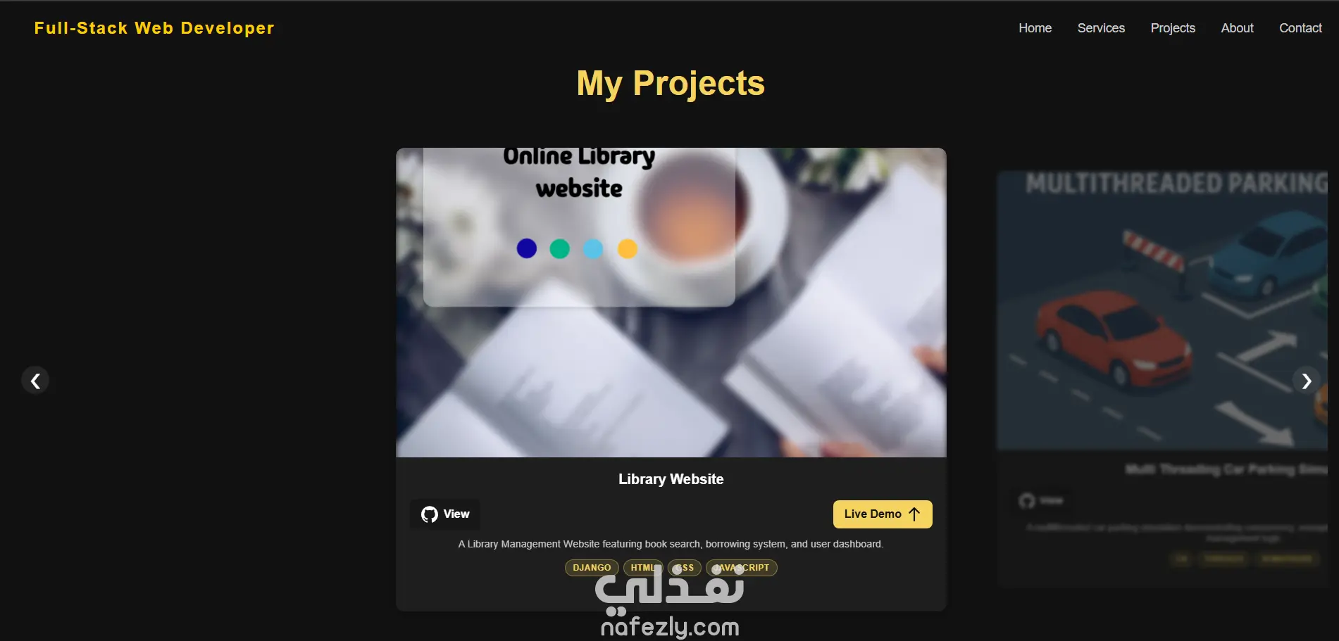 ملف أعمالي يعرض مشاريعي ومهاراتي البرمجية بشكل عملي ومرتب: يحتوي على صفحة رئيسية تعرض معلومات عني ومهاراتي. قسم الخدمات يوضح المجالات التي أعمل فيها مثل تطوير الواجهات، البرمجة الخلفية، وتحسين الأداء. قسم المشاريع يعرض مشاريع حقيقية مع وصف لكل مشروع، التقنيات المستخدمة، وروابط للمعاينة أو الكود. واجهة تفاعلية وسلسة باستخدام HTML, CSS, JavaScript، وBootstrap/Tailwind. مدعوم بـ روابط مباشرة للاتصال أو التواصل معي.