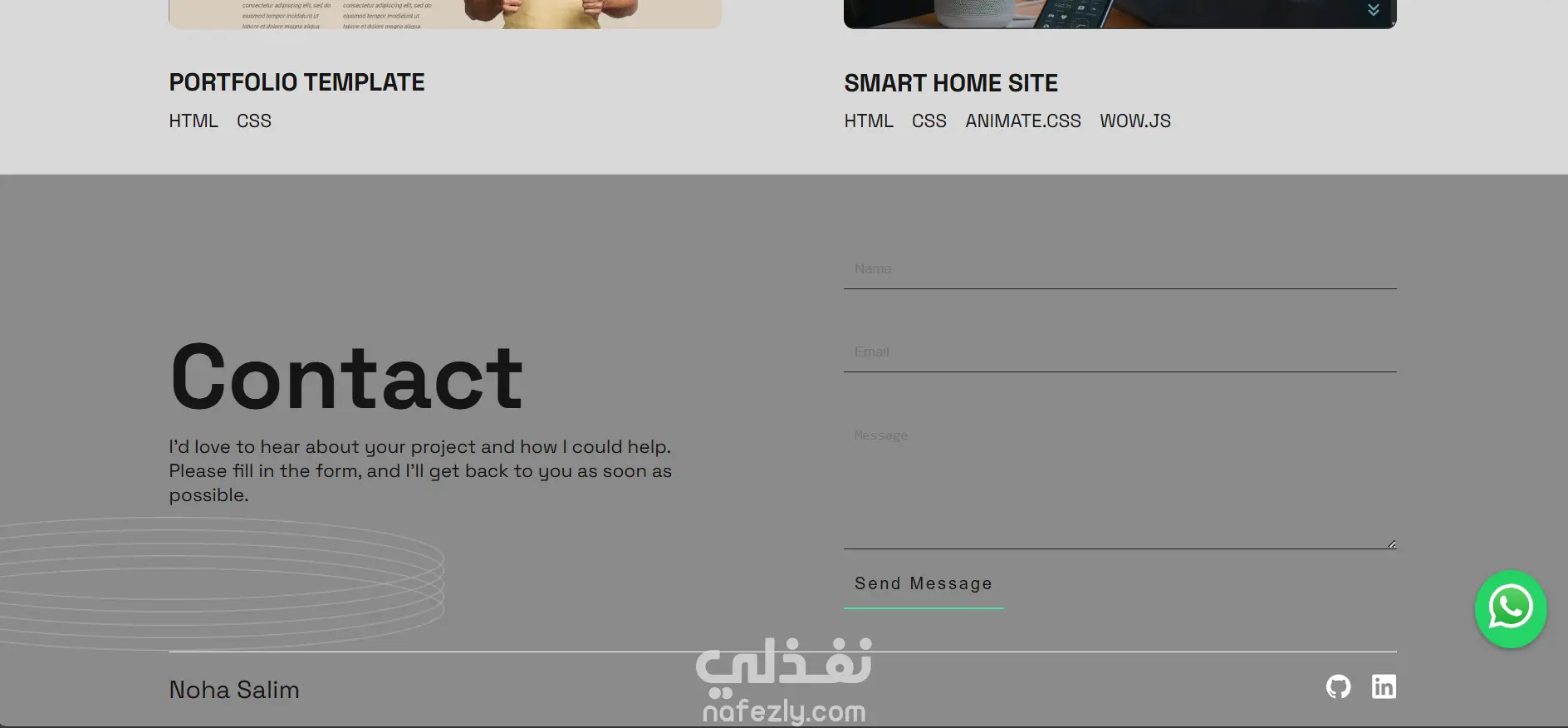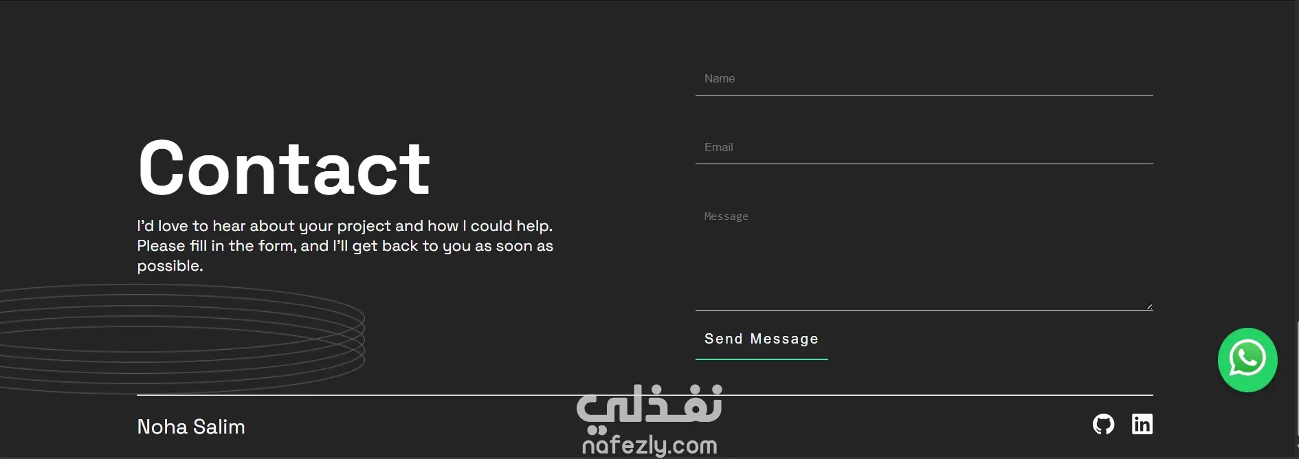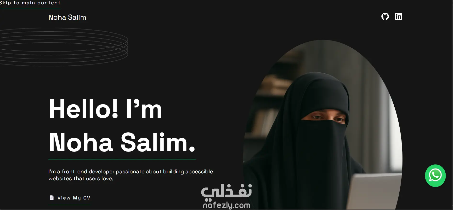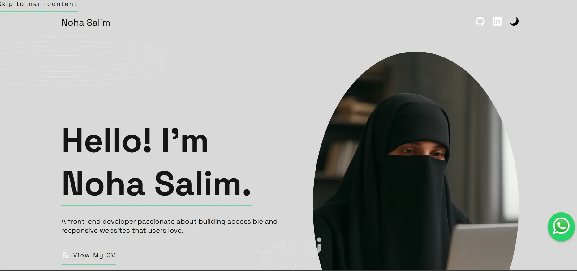 موقع شخصي حديث، متجاوب وسهل الوصول، يعرّض مهاراتي ومشاريعي ومعلومات التواصل الخاصة بي كمطوّرة واجهات أمامية. تم بناؤه باستخدام HTML وCSS وJavaScript بشكل نظيف مزود بالعرض الليلي أو النهاري، مع تفاعلات سلسة، وتكامل مع EmailJS، بالإضافة إلى ميزة التواصل عبر واتساب.